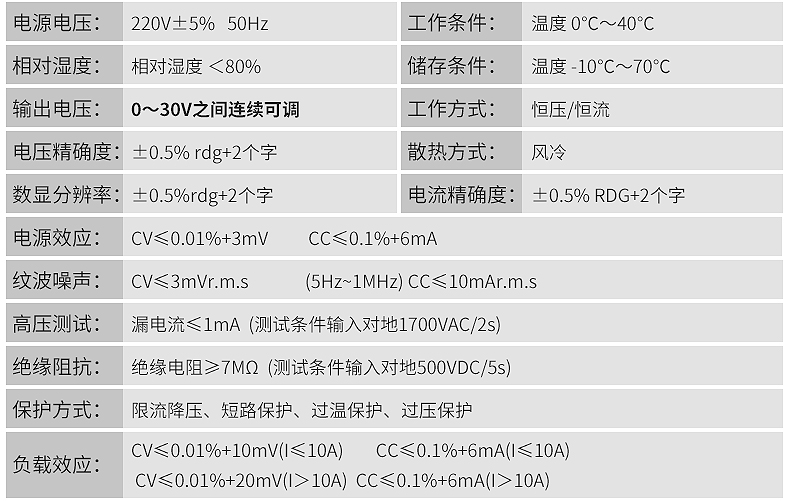 Выходное напряжение: 0 ~ 30 в постоянно регулируется Выходной ток: 0 ~ 20A постоянно регулируется Эффект электропитания: CV≤ 0.01% + 3мВ CC≤ 0.1% + 6ма Эффект нагрузки: CV≤ 0.01% + 10 мВ (I≤ 10A) CC≤ 0.1% + 6 мА (I≤ 10A) CV≤ 0.01% + 20 мВ (I>10A) CC≤ 0.1% + 6ма (I>10A) Пульсация и шум: CV≤ 3mVr.m.s (5 Гц ~ 1 МГц) CC≤ 10mAr.m.s Напряжение точность:±0.5% rdg + 2 Биты В настоящее время точность:±0.5% rdg + 2 Биты Цифровой Разрешение дисплея:±0.5% rdg + 2 Биты Высоковольтный тест: течь curren≤ 1мА (тестовое Состояние: Заземленный вход 1700VAC/2s) Сопротивление изоляции: Сопротивление изоляции ≥ 7MΩ (тестовое Состояние: Заземленный вход 500VDC/5s) Метод работы: CV/CC Типы защиты: защита от низкого напряжения, короткого замыкания, защита от перегрева, Защита от перенапряжения для всего процесса эксплуатации. Метод охлаждения: вентиляторПосылка список