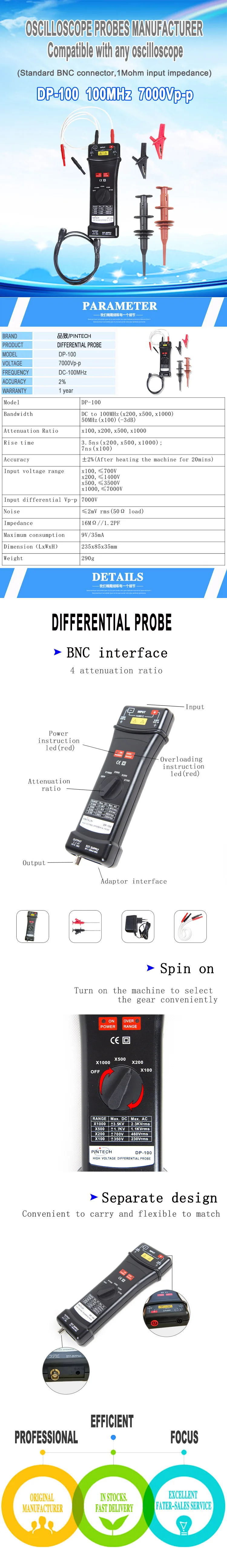 Мы являемся производителем зондов осциллографа. PINTECH-наш собственный бренд. Наши зонды имеют стандартный разъем BNC, который может использоваться с осциллографом любого бренда. Мы предлагаем OEM услуги для осциллографа многих брендов. Вы можете найти замену товара для зондов осциллографа некоторых брендов с гораздо более низкими ценами, но хорошее качество и обслуживание. Пожалуйста, оставьте мне сообщение, если вам нужна дополнительная помощь. Доставка батареи не допускается, покупайте аккумуляторы самостоятельно.