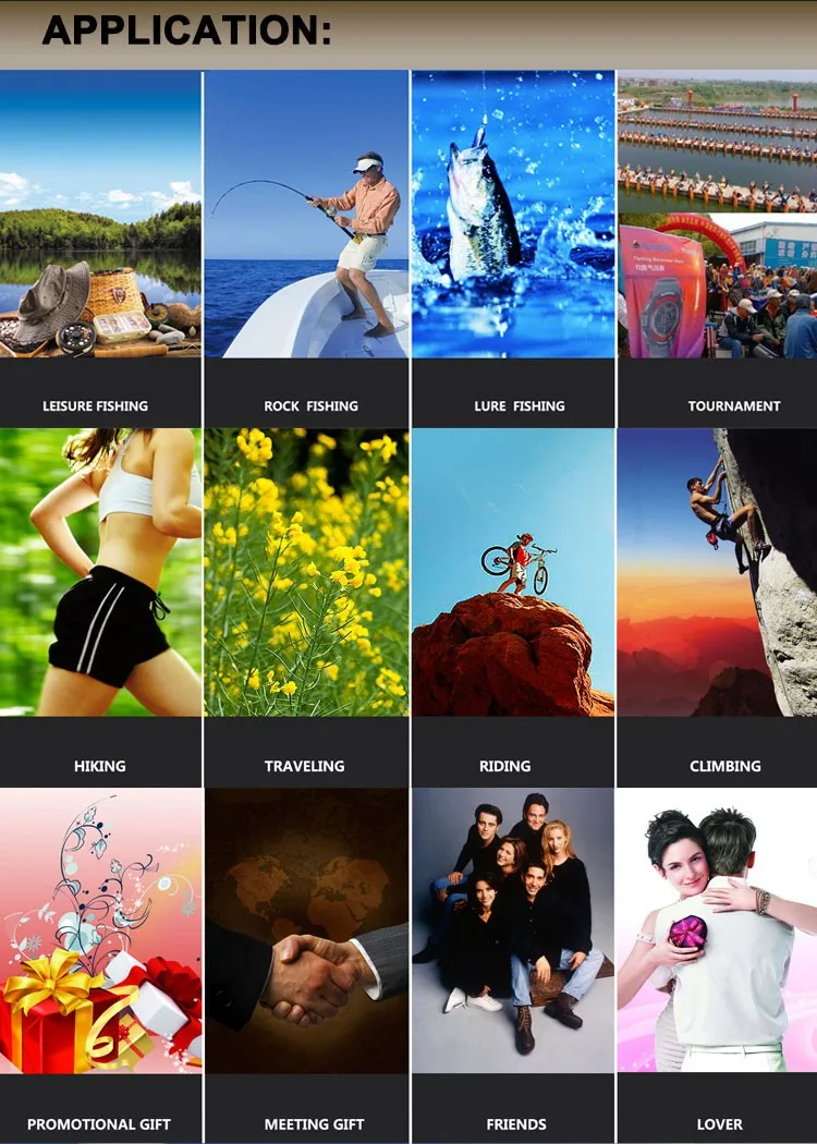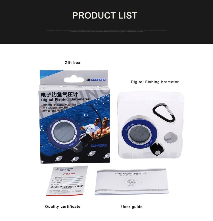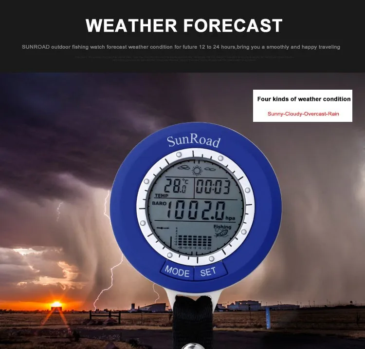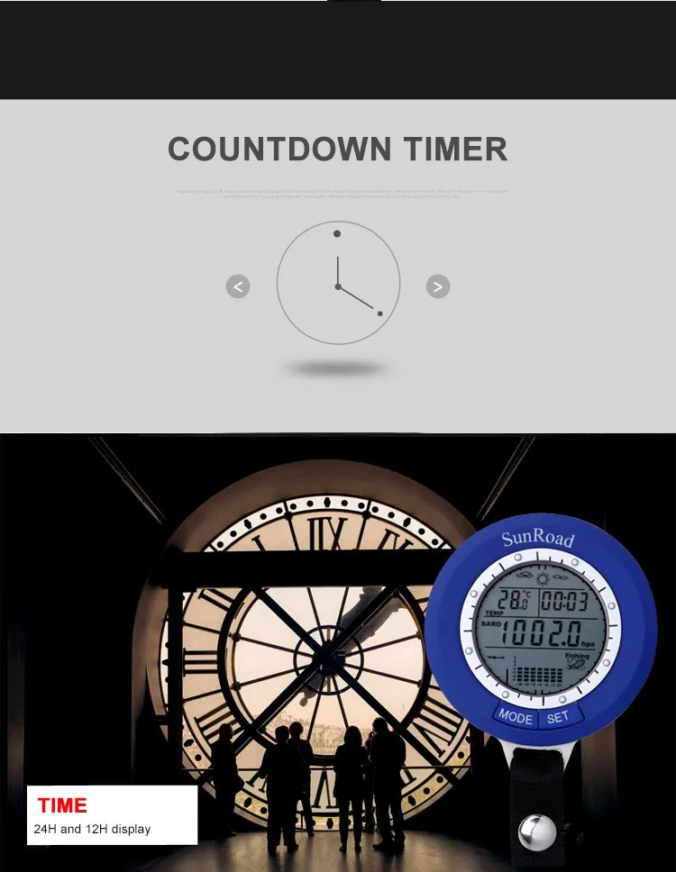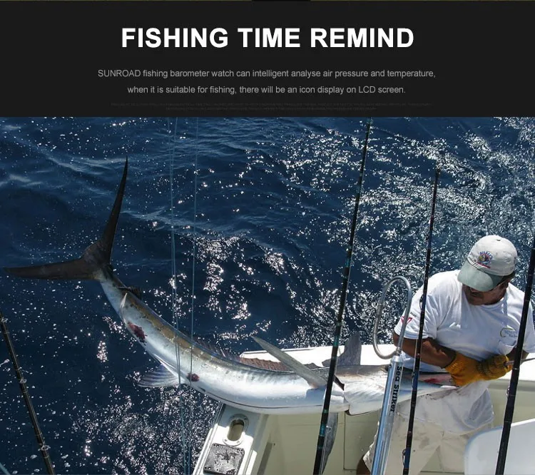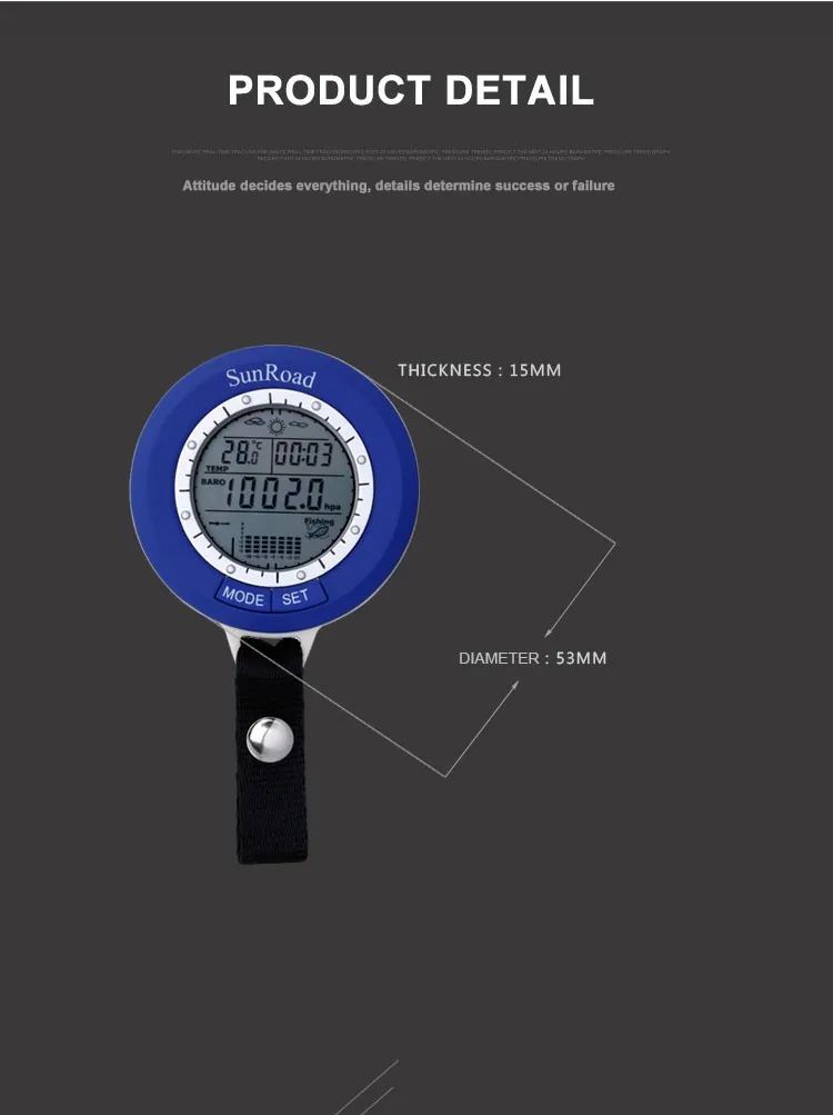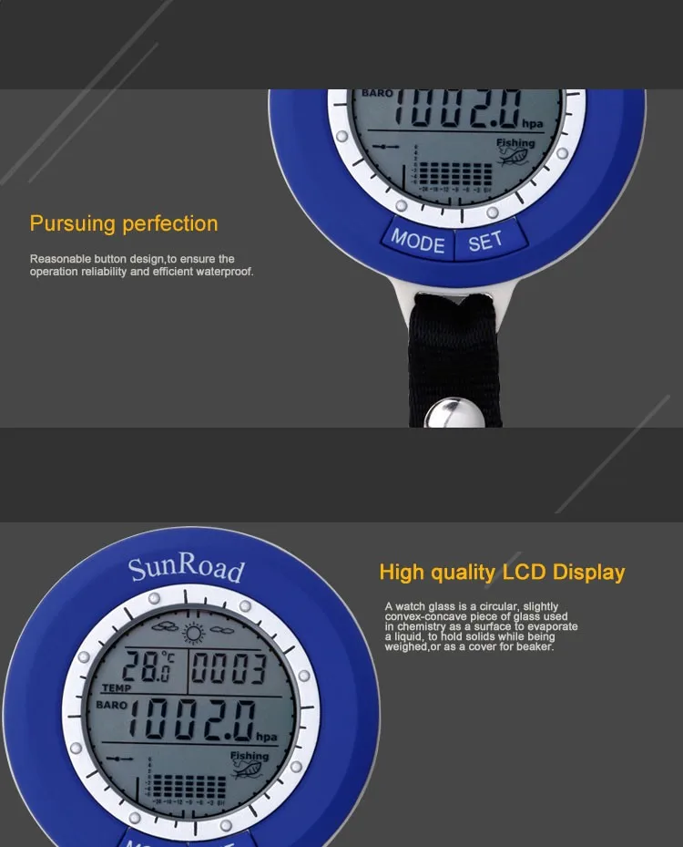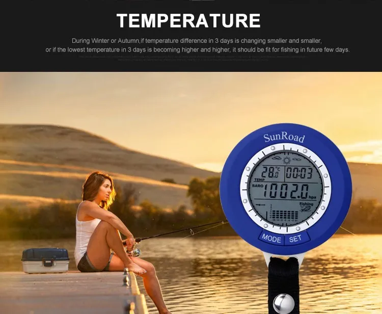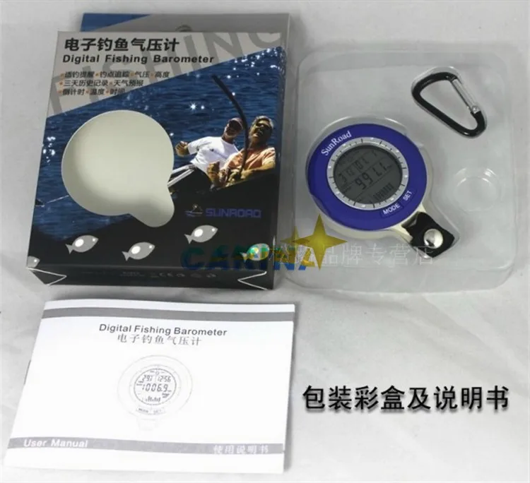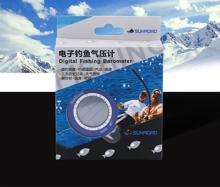 рыбалка барометр SR204 предназначен специально для любителей рыбалки. он может отслеживать давление воздуха на 6 мест рыбалки, где вы находитесь, и напомнить вам рыбалки время бойко. она также включает высотомер, барометр, термометр, прогноз погоды и времени функции и т. д.