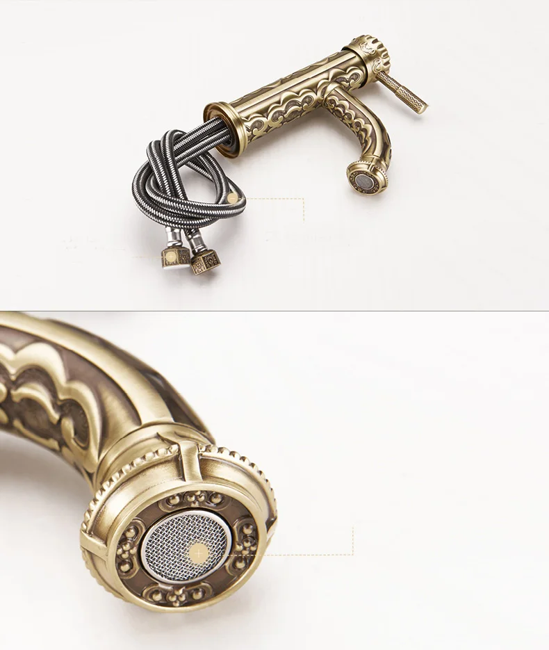 Роскошный художественный высокое качество Полностью корпус из латуни Латунь полированная поверхность Однорычажный узор ручки Высота крана 205 мм 8" Носик достигается 120 мм 4 3/4" Высота носика 70 мм 2 3/4" С 60 см гибкими рогами. Поставляется со всеми стандартными аксессуарами и монтажными деталями Гарантия качества наших смесителей/душевой набор: 1. Отделка-Прочный толстый слой латунная полированная отделка устойчива к коррозии и потускнению. 2. Корпус изготовлен из тяжелой твердой латуни для долговечности и надежности. Тяжелее, тем лучше. Не выбирайте подвесной светильник. 3. Клапан оснащен керамическими дисковыми клапанами без капель для долгой жизни и гладкости. Не выбирайте кран с пластиковыми клапанами