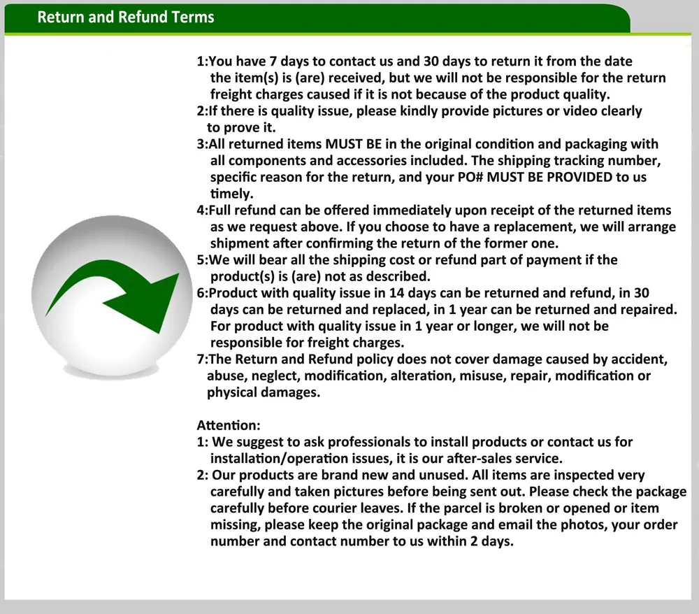 1:Мы стремимся вести долгосрочный бизнес с каждым клиентом на основе честности, доверия и взаимного доверия, поэтому мы хотели бы предоставить наш лучший сервис для тех, ктоУважайте и цените нашу работу.Мы считаем, что все проблемы могут быть решены дружественным образом. Так что если есть какие-либо проблемы с нашим продуктом, пожалуйста, не стесняйтесь связаться с нами.
