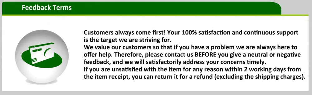 Но приветствуются только серьезные покупатели! Кроме того, гарантия не будет предоставлена тому, кто оставляет отрицательный нейтральотзывы, открытый случай или открытый запрос на возврат.