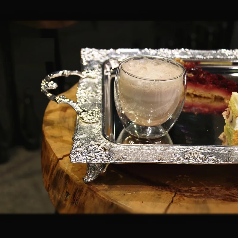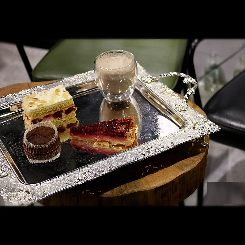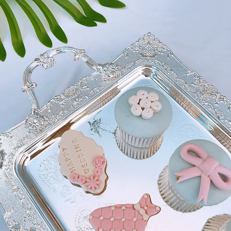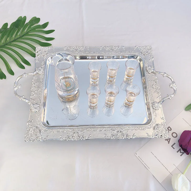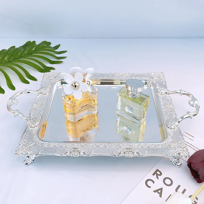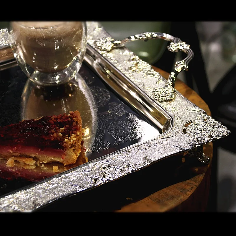 Номер товара; FT018 Название товара; Модный, серебряный, металлический поднос для отрезания, декоративный поднос для торта Цвет; Посеребренный Материал: металл iorn Размер; Как показано на картинке. Особенности; Модный дизайн, полый дизайн по краям. Лоток с двумя ручками.
