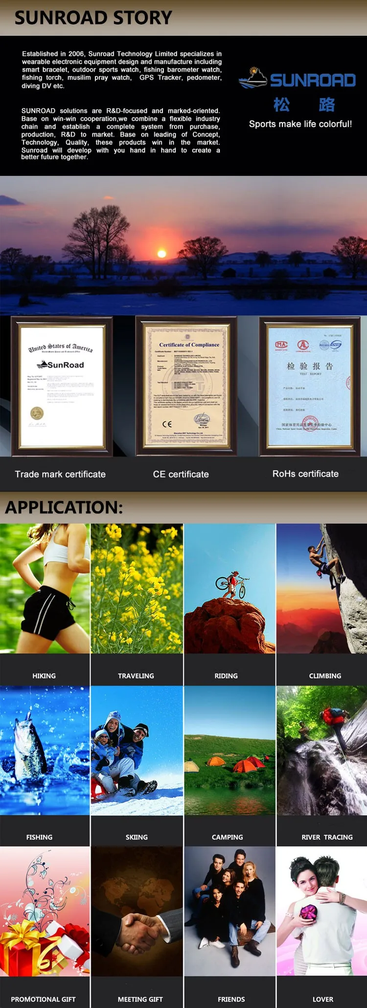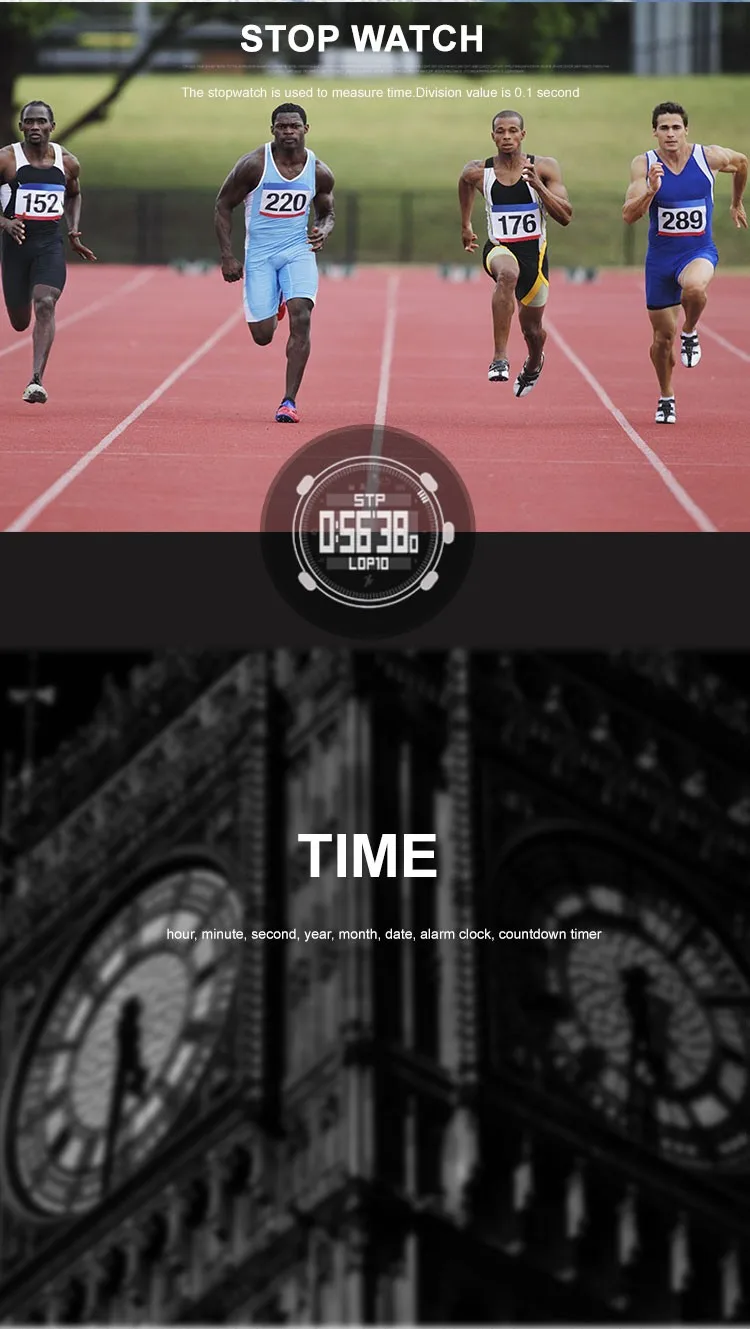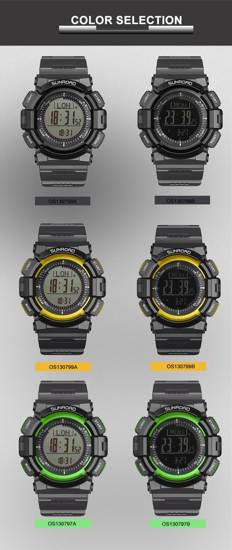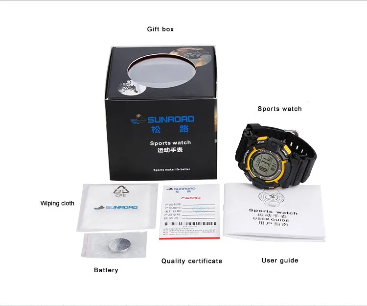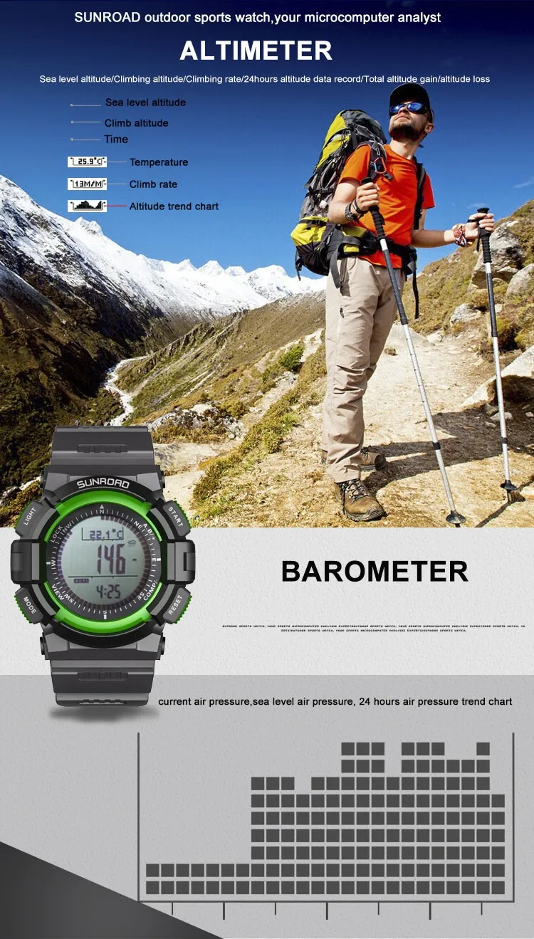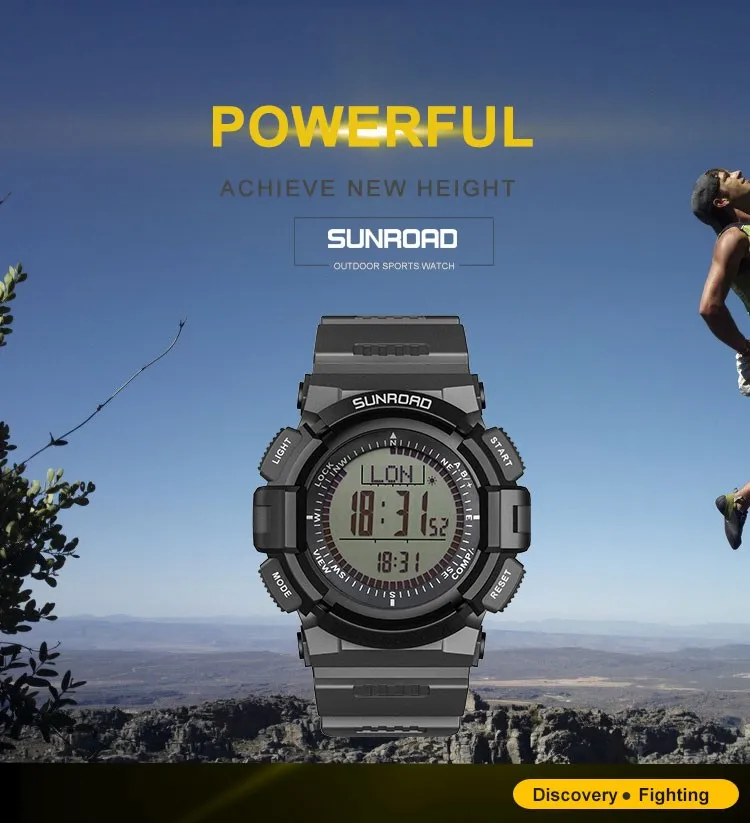 Спортивные часы FR821A разработаны специально для альпинистских команд, любителей активного отдыха, любителей путешествий. Он сочетает в себе высотомер, барометр, компас, шагомер, мировое время, прогноз погоды, таймер обратного отсчета, секундомер, время и дату и т. д.