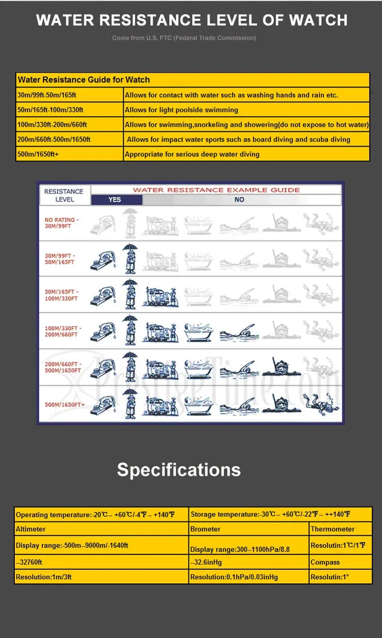 -Функции времени: час, минута, секунда, год (2000-2099), месяц, дата, будний день, 12 ч/24 ч -Будильник (2 комплекта будильника, ежечасный будильник) -Таймер обратного отсчета (99: 59: 59 до 0) -Секундомер (от 0 до 99: 59: 59), 11 наборов данных -Шагомер, счетчик шагов, калории, запись расстояния -Корпоративный цифровой компас, высотомер, барометр, термометр, тренд давления воздуха и тренд высоты -Тренд давления воздуха в течение 24 часов -12 часов Высота тренда и скорость подъема -Прогноз погоды -Мировое время (переход на летнее время автоматически) -Кнопка включения или выключения -Срок службы батареи -Подсветка EL Высотомер Диапазон отображения -От 500 м до 9000 м (от-1640 футов до 32760 футов) Разрешение 1 м/3 фута Барометр Диапазон отображения От 300hpa до 1100hpa (от 8,8 до 32,6 inHg) Разрешение 1hpa/0,03 inHg Термометр Диапазон отображения -20 градусов до 60 градусов (-4 Фаренгейта до 140 Фаренгейта) Разрешение 1 градус/1 Фаренгейт Компас Режим отображения: 360 ° С шестнадцатью направлениями Разрешение 1 ° Время и дата Режим отображения 24 H или 12 H в наличии Подсветка Режим отображения Подсветка EL Уровень водонепроницаемости Водонепроницаемость 3 АТМ Аксессуары Аккумулятор кнопки CR2032 1 шт. Руководство пользователя 1 шт. Упаковка Вес изделия 0,20 кг Деменция продукта 45X10 мм Упаковка 1 шт/Подарочная коробка, 45 шт/картонная коробка Мастер коробка demension 52,5x32x30 см Вес картонной коробки G. W. 12 кг, N. W.10 кг