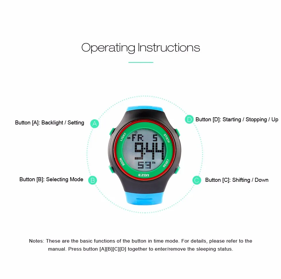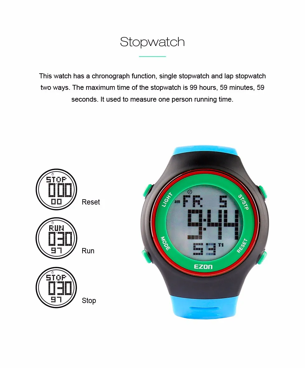 Секундомер--Секундомер является точным 0,01 во-вторых. Максимальное время секундомера-99 часов, 59 минут, 59 секунд. Секундомер имеет два способа: один секундомер и секундомер на коленях. Один секундомер используется для измерения времени работы одного человека. Секундомер на коленях используется для записи времени на круге и времени разделения, он может записывать время на 10 кругов.
