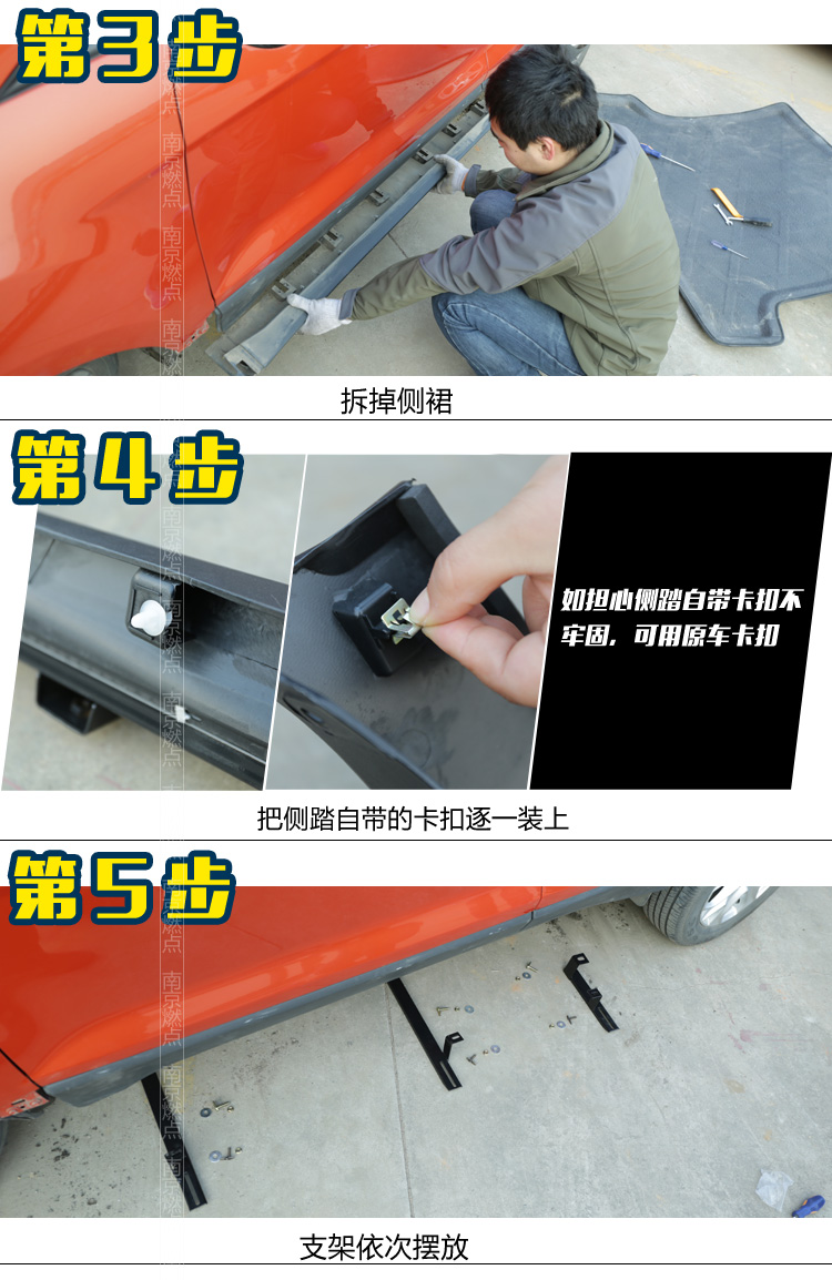 Узнайте оригинальные отверстия на шасси автомобиля --- Установите кронштейн ---- затем закрепите боковую часть. Очень просто. (непосредственно Установите на оригинальные отверстия без сверления отверстий. Очень легко. Вы можете установить его самостоятельно. (Если у вас нет инструментов,Я предлагаю вам доставить его на автосервисную станцию с просьбой о помощи.
