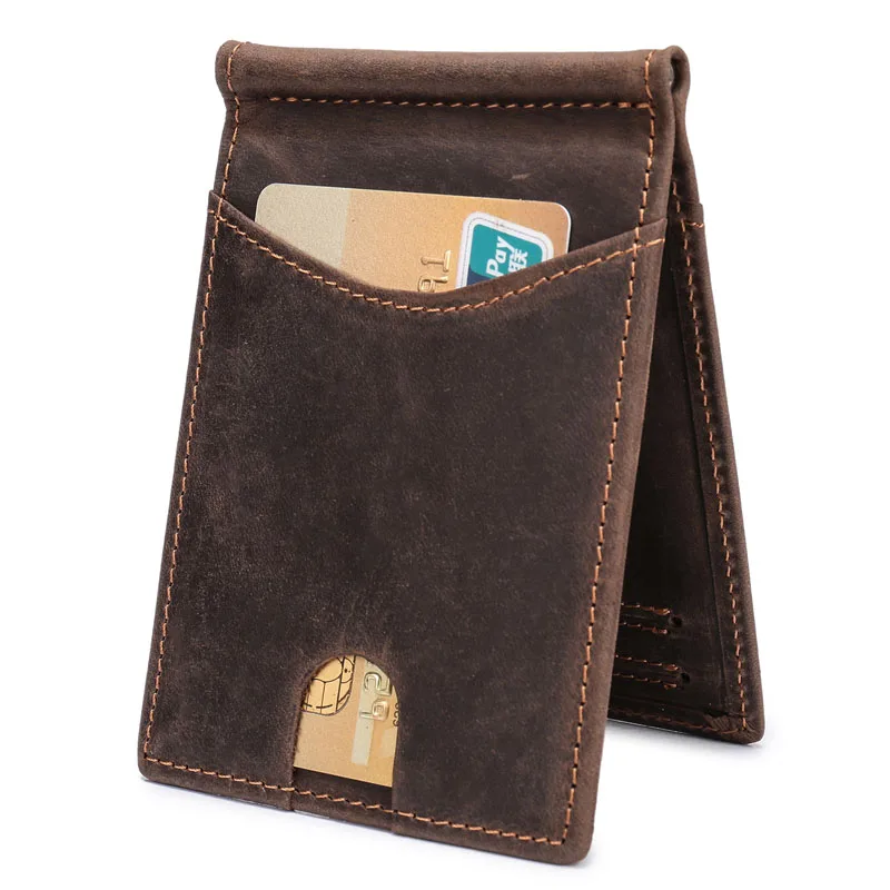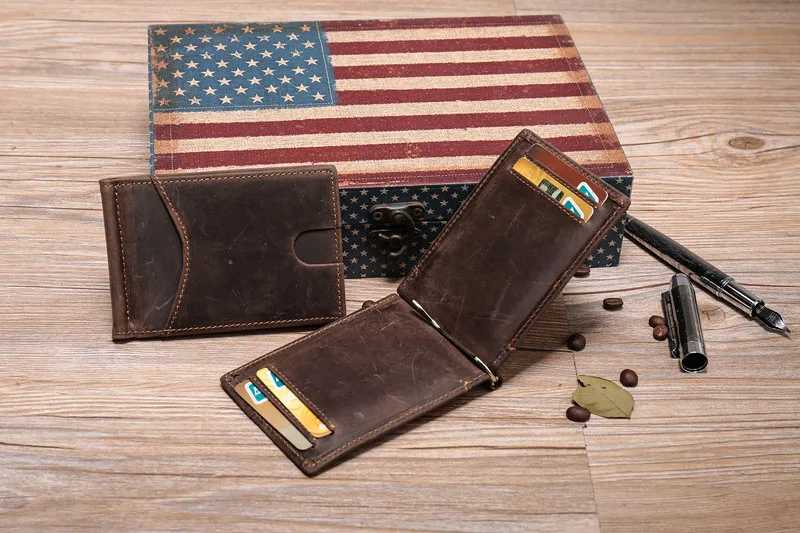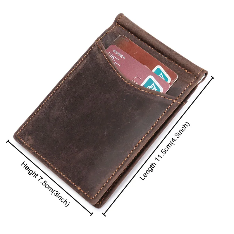 Men Cowhide Genuine Leather Card Holder Crazy Horse Leather Slim Minimalist Wallet Vintage Magnetic Carteira Masculina R9007 -Material: Made with the Finest Full Grain genuine leather -Size:11.5X7.5X1CM -Design: Slim and compact design, holds up to 4-10 cards plus US bills with no bulk -Feature: with hardware clip -Function: RFID BLOCKING -Warm Tips : ★As the shooting light, technology and displays reasons, objects and photos maybe some differences, please in kind prevail. ★Due to manual measurement, the figure shows for reference purpose only. Have 1-2 cm Error,if you Mind,please don't buy. ★For crazy horse leather, it is easy to get scratch in daily use. But the leather will get brighter by days go on. It is of wild and vintage style. If you mind scratch, it is not a good choice for you to buy this style of wallet.