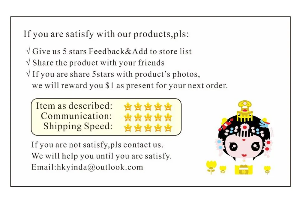 Если вы удовлетворены нашими товарами и обслуживанием, пожалуйста, дайте нам положительный отзывы с пятью звездами.