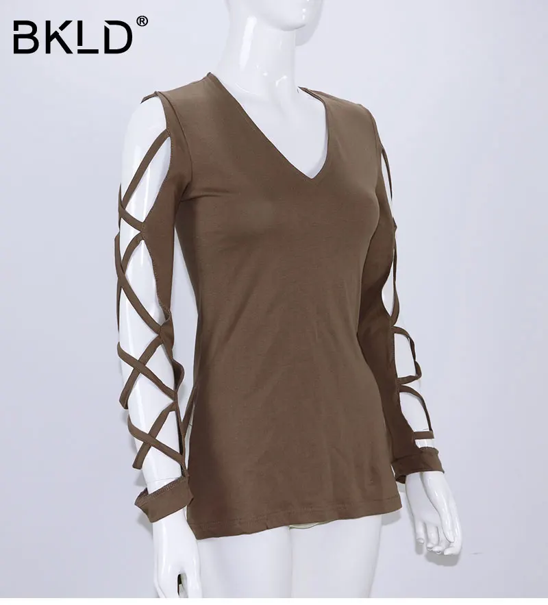 BKLD Харадзюку полый рукав 2018 Осенняя Сексуальная футболка с разрезом женская короткая спереди длинная сзади женские топы модная футболка с v-образным вырезом