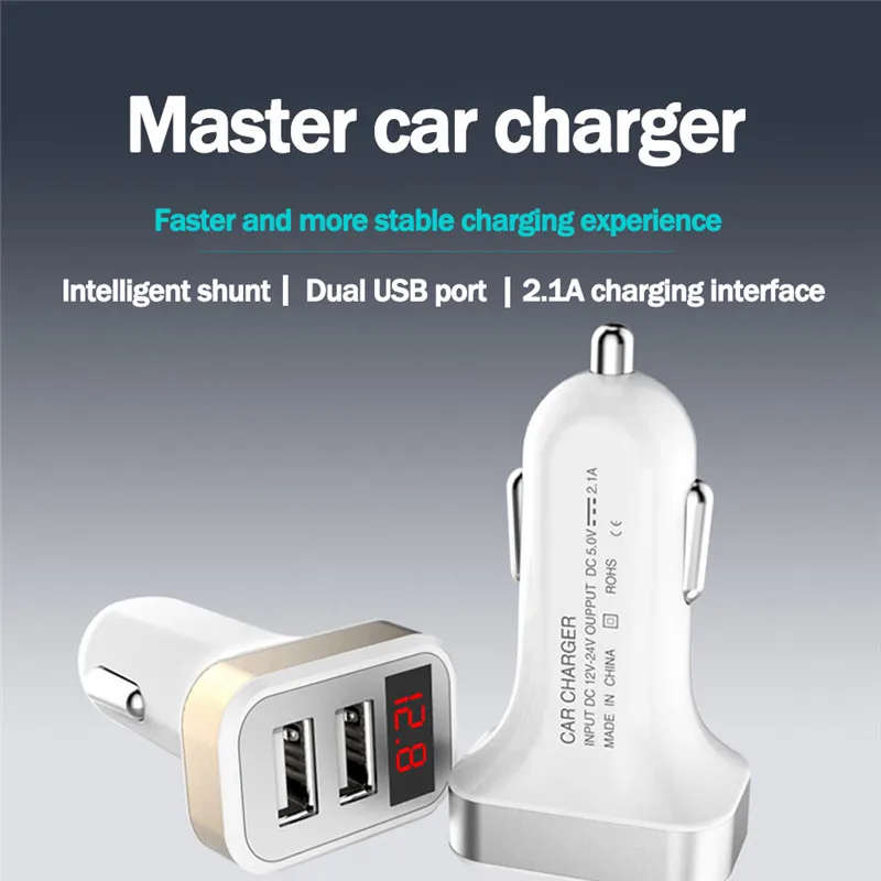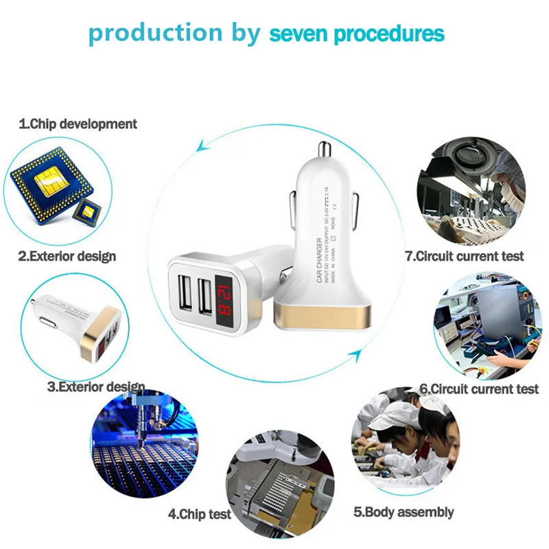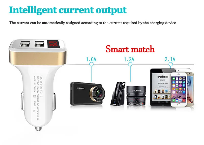 Продукт Особенности: 1. Интеллектуальное обнаружение напряжения автомобильного аккумулятора. 2. Отображение напряжения и тока зарядки USB. 3. Два порта USB работают одновременно, заряжайте 2 устройства. 4. Отрегулируйте выходной ток автоматически, в зависимости от различных устройств. Подробная информация о продукте: Цвет: Золотой/Серебряный Размеры: 6 см * 3,5 см * 2,4 см Материал: АБС-пластик + электроника Упаковка: в штучной упаковке Технические характеристики: Вход напряжение: 12V-24V Выходное напряжение: 5 В Выходной ток: 2.1A (порт 1-1A, порт 2-2.1A)