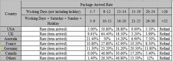 Мы осуществляем доставку по всему миру (кроме некоторых стран и почтового отделения флота и армейской почтовой службы).При заказе мы грузим только на подтвержденные адреса. Ваш адрес заказа должен совпадать с вашим адресом доставки.Заказы обрабатываются в указанный срок после подтверждения оплаты.Мы отправим посылку с Китая через авиапочту. Время доставки зависит от работы транспортной компании, таможни и почты пункта назначения, а также от других факторов. Большинство посылок может быть получено через 20 рабочих дней (4 недели). Смотрите ниже информацию о времени доставки и количественных данных: