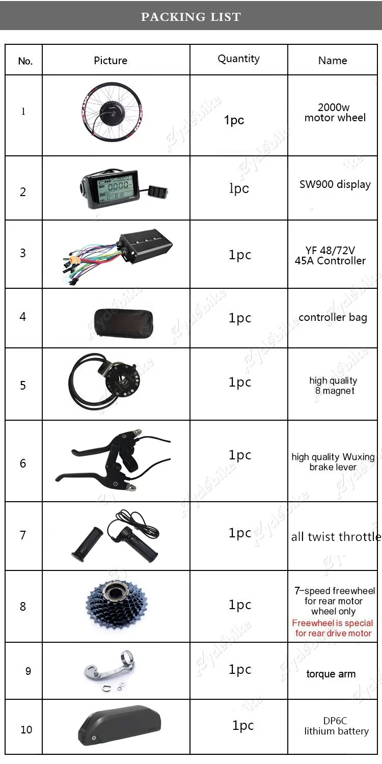 1. 52V 2000W Мощный бесщеточный безредукторныйMTXОбод колеса велосипеда: 20 "24" 26 "27,5" 28 "29" 700c2. Дисплей:SW9003. Контроллер: 52 в45Умный контроллер amp4. Пакет контроллера5. PAS: новейший 8 manget pas6. Электрические тормозные рычаги: WuXing электрические тормозные рычаги7. Все закрученные дроссельные заслонки8. 7-скорость маховик (только дляЗадний привод)9. Рычаг крутящего момента безопасен для клиента какПодарок.10,52 в17ачСтильная литиевая батарея DP11,1x52v 2A зарядное устройство12. Книжное производство, галстуки13. Хорошая упаковка