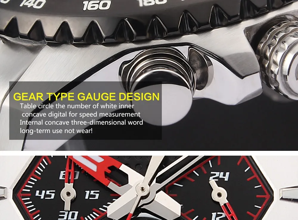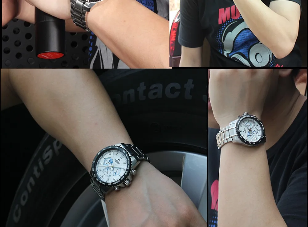 2. Круглый циферблат, три циферблата для функции хронографа, шесть рук, японский кварцевый механизм, точное время хранения