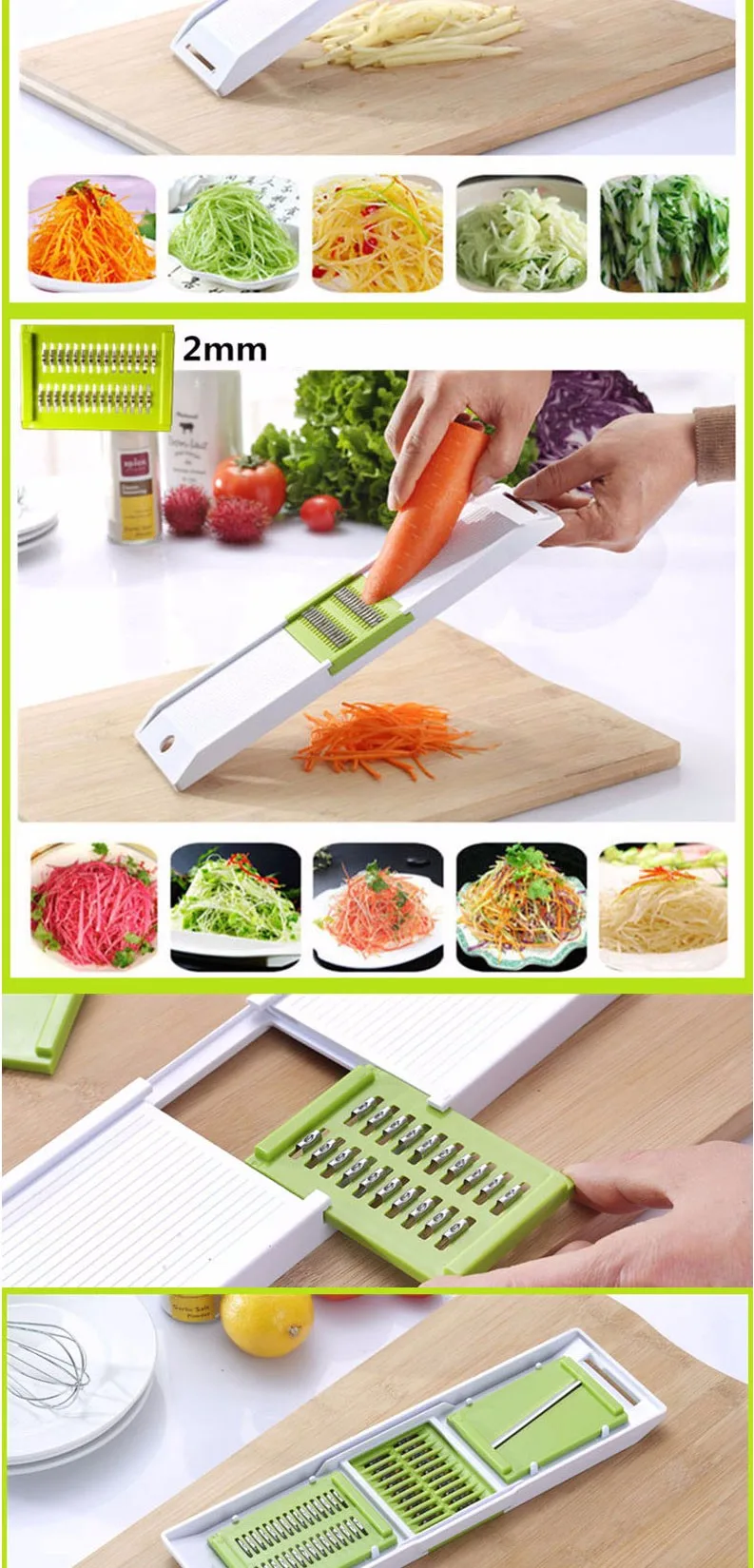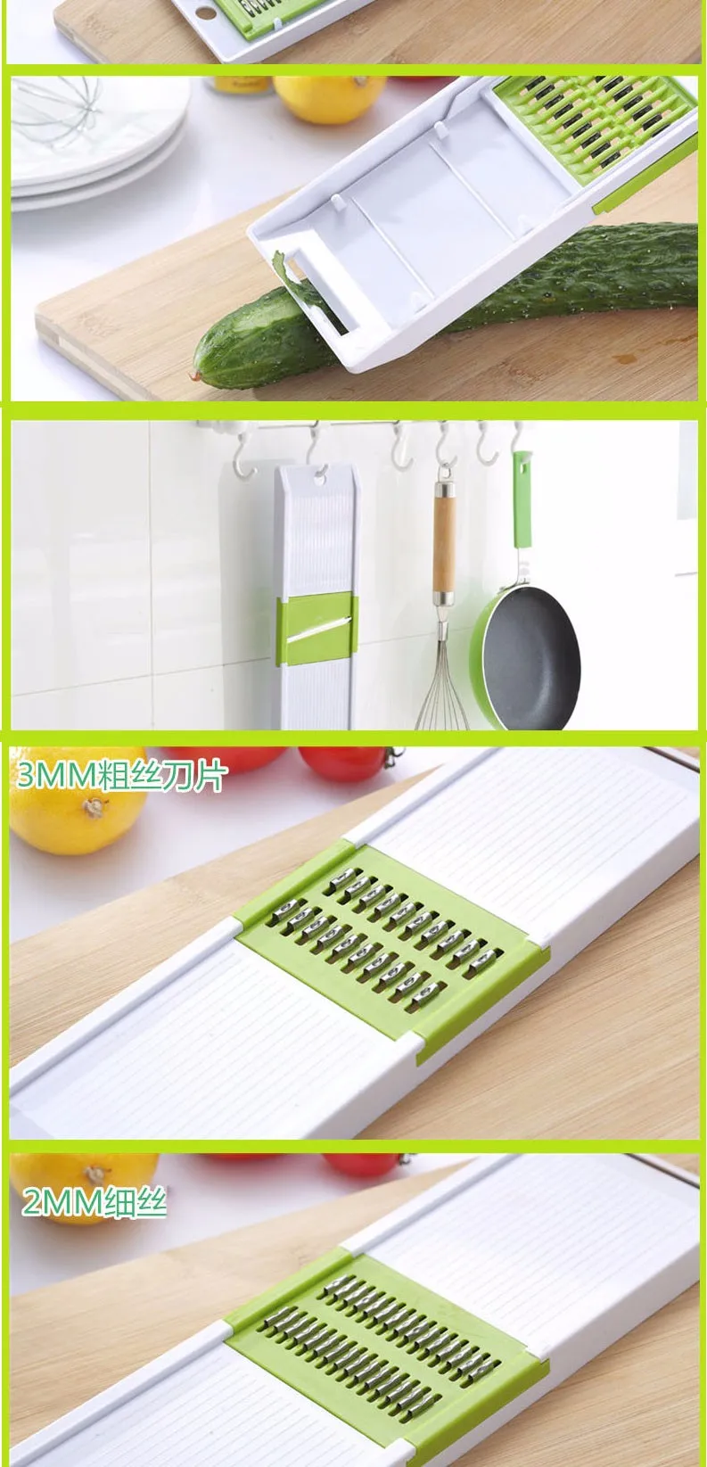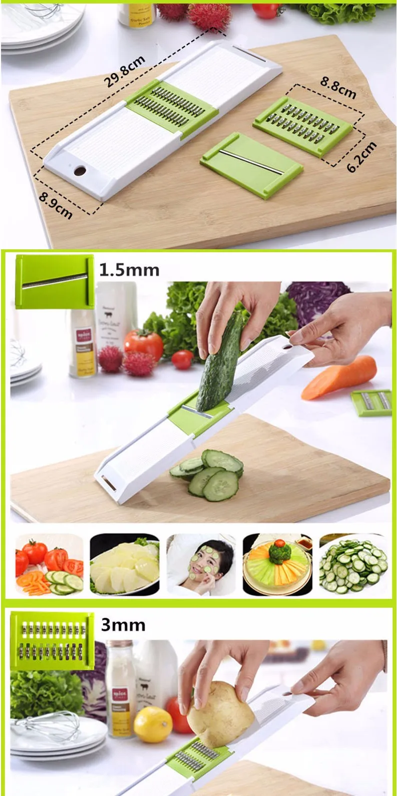 Описание: -Отличные подарки для друзей. -Удивительный кухонный инструмент для экономии времени при нарезке овощей и фруктов. -Креативные Многофункциональные кухонные инструменты, набор для резки мандолина 5 в 1. -Для нарезки и нарезки различных фруктов и овощей! Посылка 1 * Съемная мандолиновая слайсер, это жесткая пластиковая рамка из АБС-пластика. 1*2 мм (0,079in) лезвия Julienne. 1*3 мм (0118 дюйма) лезвия для Julienne. 1*1,5 мм лезвиями для нарезки соломкой. Уведомления: 1. Будьте осторожны с острыми лезвиями! Держите этот инструмент подальше от ваших детей и Избегайте тепла. 2. Очистите краску под водой. После очистки, пожалуйста, проветривайте. 3. Когда овощ маленький или уменьшается в размере (ниже 2,5 дюйма), пожалуйста, используйте Безопасность шапка.