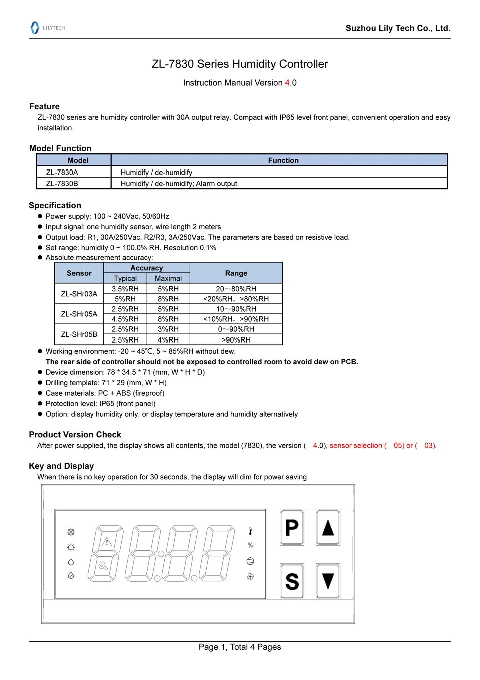 Диапазон установки:0 ~ 100.0% RHРазрешение: 0.1% RHВыход:R1, 30A/250Vac. Параметры основаны на резистивной нагрузке.Рабочая среда: -20 ~ 45 ℃;5 ~ 85% RH без росыЧехол Размер: L78 x W34.5 x D71 (мм)Размер сверления: L 71 x W29 (мм)Чехол материалы: поликарбонат + АБС-пластик, огнеупорныеУровень защиты: IP65 (только передняя панель)