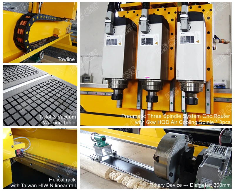2000*3000*200 мм рабочий размер6 кВт HQD шпиндель воздушного охлаждения 3 головки7.5kw Fuling инверторТ-образный слот и вакуумный столТайваньские квадратные рейки HIWIN для оси X, Y, Z #20Шаговый двигатель FL118,YAKO2811 драйверСистема управления DSPПылезащитная щетка, труба и рамаUcancam 2012 программного обеспечения8 мм сверхмощная конструкция корпуса24 шт. Фасонная фреза300 мм ротарное устройствоПараметры: