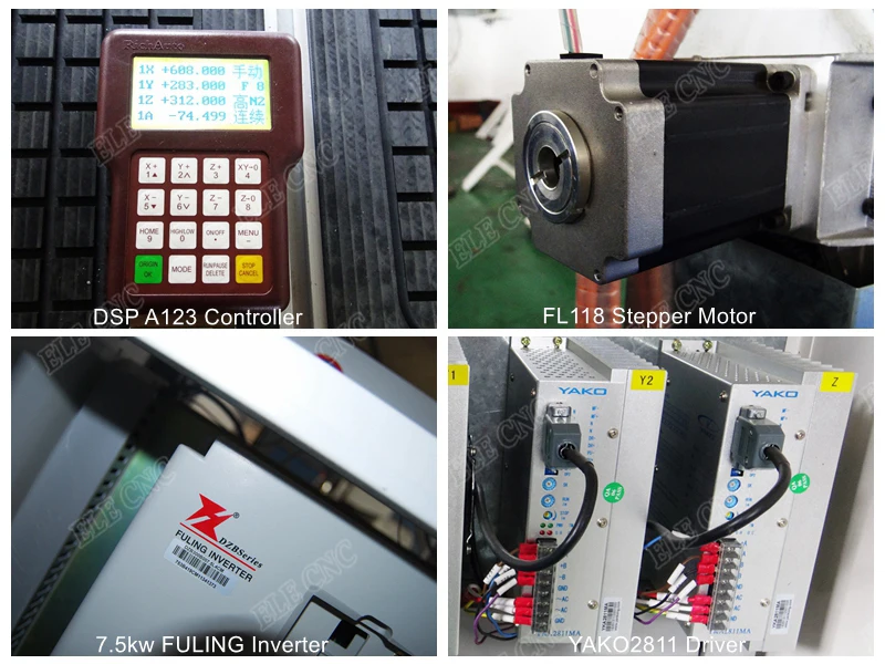 ОписаниеПараметрыВ заказе будет отправлена модельELE 2030Рабочая зона2000*3000*200 ммУправление системыDSP A123 система управленияШпинделя6 кВт HQD шпиндель воздушного охлаждения * 3Скорость вращения шпинделя0-18000 об/минИнвертор7.5kw Fuling инверторМотор и водительШагового двигателяНапряжение380 В, 3ph, 50 Гц (220 В на выбор)Линейный рельсТайвань PMI 20 # линейная направляющаяСтруктура таблицыНовый тип толще и больше сверхмощная сварная рама и КозловойПоверхность столаВакуумный Рабочий столПередача оси X,YСпиральная стойка и шестерня привода для оси X,YПеремещение по оси Z передачиТайвань TBI 2510 шариковый винт для оси zПрограммное обеспечениеUcancam 2012
