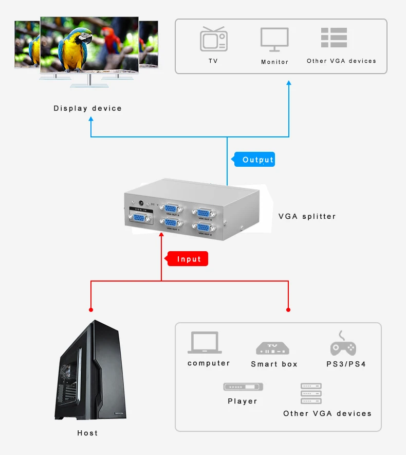 Видеоразветвитель VGA, который распределяет один видеосигнал на несколько дисплеев. Это 1 в 4 out 250 МГцСплиттер VGAМожет выводить один источник VGA на два VGA-дисплея. Разрешение также может достигать 1920*1440. Эта серия разветвителей VGA,MT-VIKIМожет обеспечить 2/4/8 портов, в то время как полоса пропускания составляет 150 МГц, 250 МГц, 350 МГц, 500 МГц различные VGA разветвители. Этот сплиттер может значительно снизить стоимость, подключи и играй, простой и удобный ..
