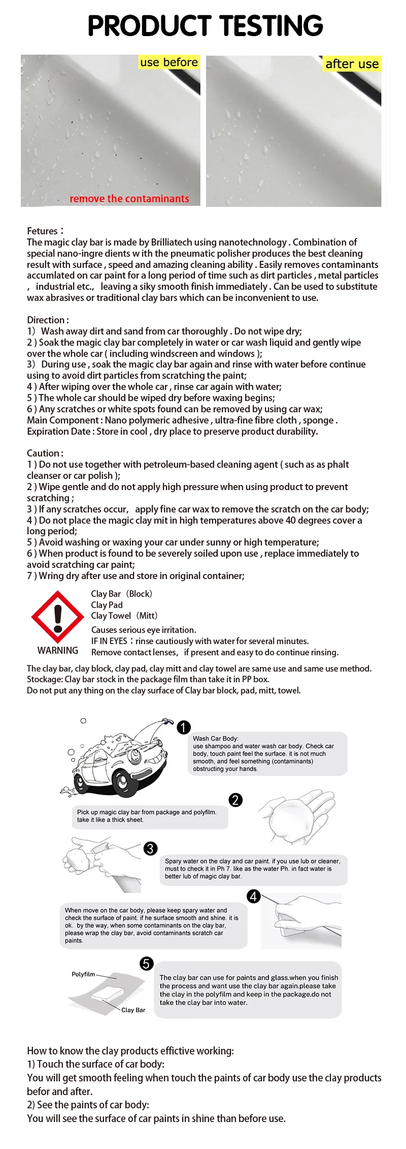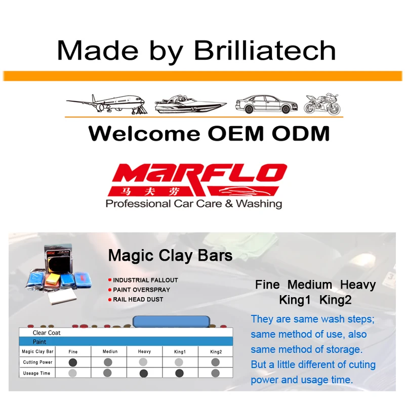 (Удаляет напыление, железнодорожную пыль, тормозную пыль, загрязнение) от автомобильных красок.Рекомендуется:(Грязное означает загрязняющие вещества)Deepy Dirty: >Используйте пионт, K2 глиняный брусокОтносительно грязный:>Используется тонкая, средняя, K2 глиняная планкаСредний грязный:>Используйте тяжелый и K1, K2 глиняный брусокГрязный светильник:>Используйте тяжелый и K1, K2 глиняный брусокВсе Волшебные глиняные стержни MARFLO сделаны Brilliatech.Очистка вашего автомобиля