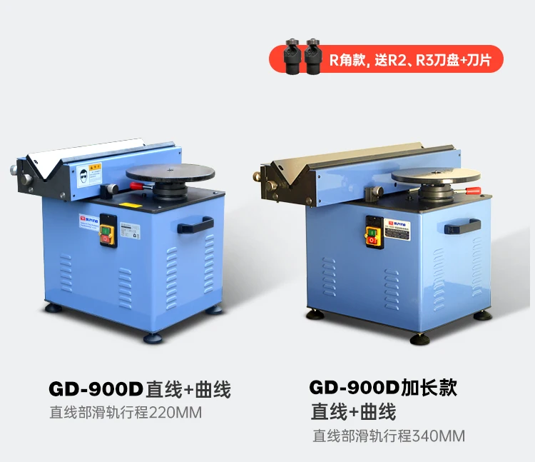 GD-900D Lengthened Compound Chamfering Machine (newly upgraded, can be chamfered with R angle): The linear part has its own slide rail, which can be fixed or slidable. 540m, with C angle cutter head as standard, and R angle cutter head (R2/R3) for R angle model.