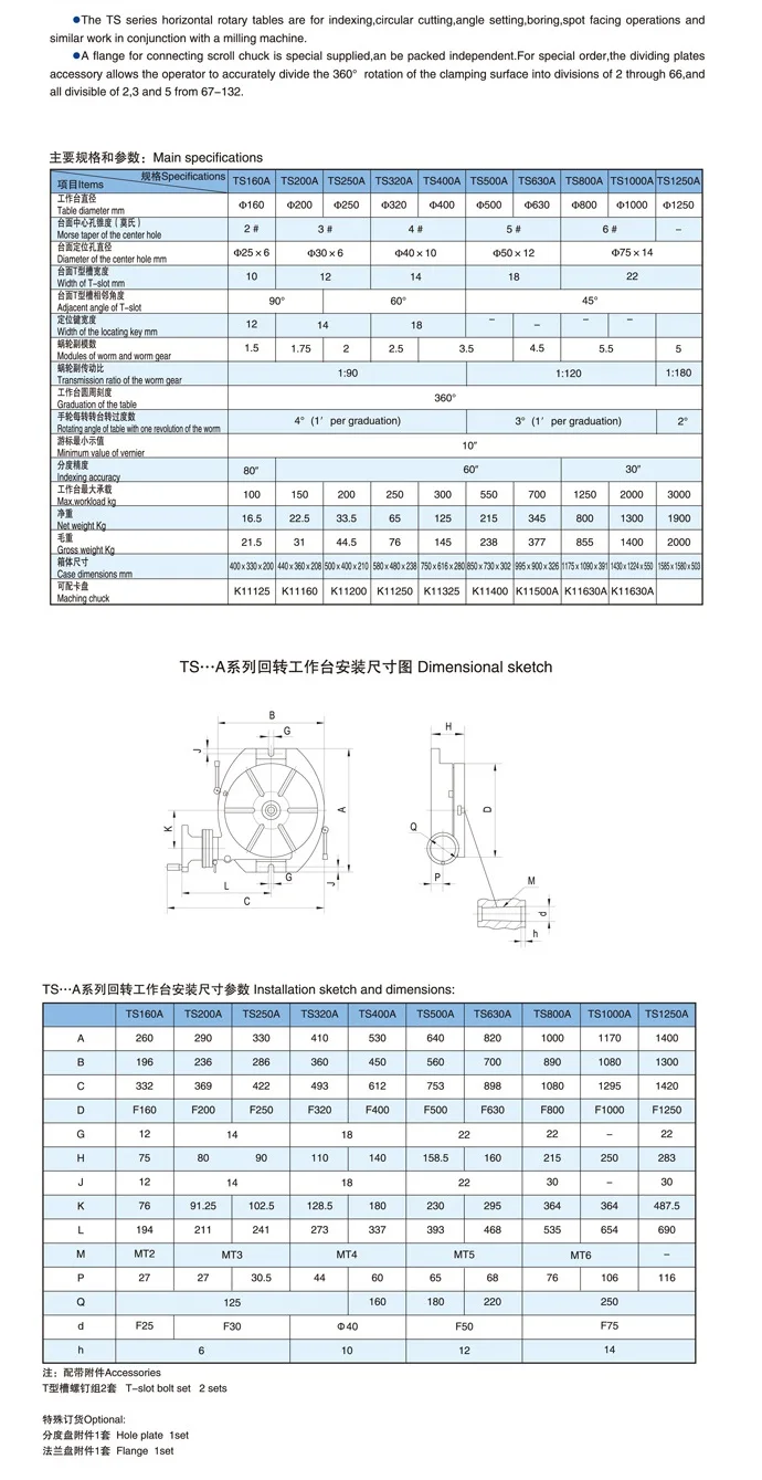Поворотный стол серии TS является одним из основных аксессуаров фрезерного станка. Он используется для индексации сверления или фрезерования, окружной резки, обработки окружной поверхности, плоской и линейной обработки некоторых сегментов линии на фрезерном станке.