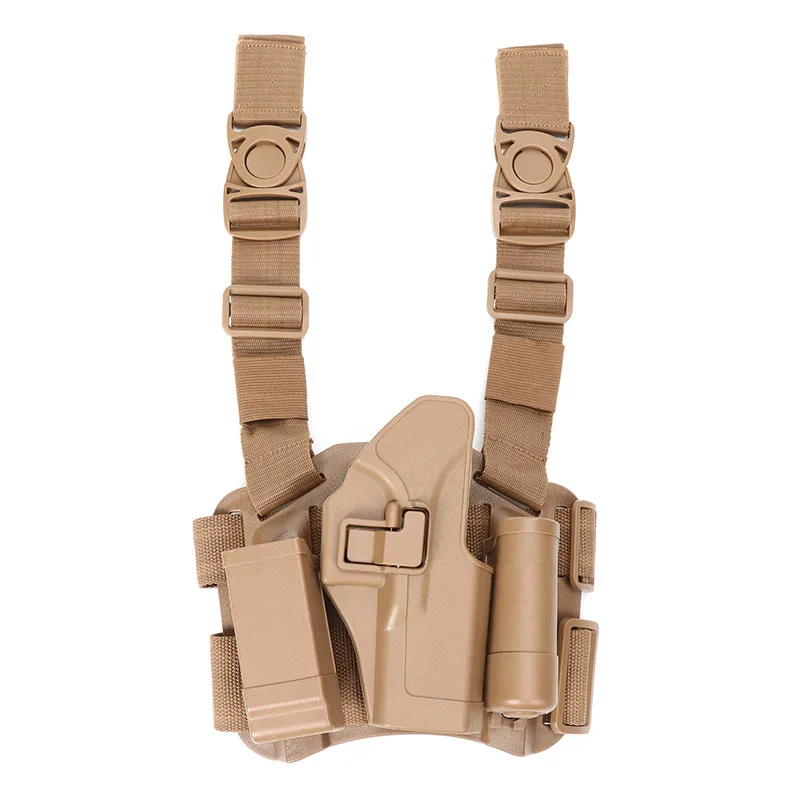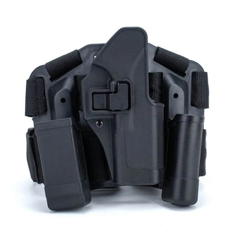 Тактическая кобура обеспечивает несравненную скорость и комфорт, безопасность системы блокировки Платформа для бедер, предназначенная для дыхания, соответствует размеру ноги Вертлюжные пряжки на петлях для ремня позволяют сочленить для максимальной эластичности регулируемые Горизонтальные и вертикальные ремни для ног Чехлы для журналов и фонариков можно быстро снять и установить Материал: АБС-пластик Вес: 560 г Размеры: 18x17x7 см/7.09x6.69x2.76in Подходит для Glock 17 19 22 23 31 32