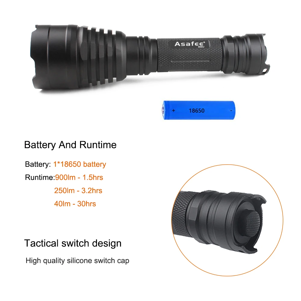 Asafee B58U охотничий фонарик использует CREE XM-L2(U4) светодиодный, обеспечивающий максимальный выход 900 люменов. Этот охотничий фонарик питается от одного литий-ионного аккумулятора 18650 с максимальным временем работы 1800 минут. Плюс дизайн тактического переключателя с хвостовой крышкой, IPX-8 Стандартные водонепроницаемые характеристики и Дальний пучок 390 м, Brinyte B58U-лучший инструмент для освещения дальнего света, А также различные виды охоты или активного отдыха, такие как кемпинг, туризм, рыбалка и т. д.