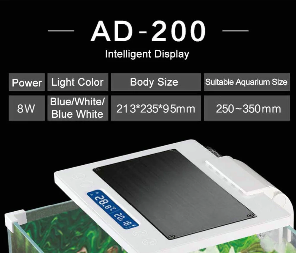 Отображение времени, а также таймер интегрированы в контроллер. С помощью таймера вы можете установить время на светильник для включения и выключения в вашем нано-аквариуме. Прочитайте температуру воды непосредственно на дисплее освещения.
