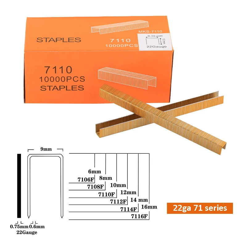 1) Корона: 9,1 мм 2) Диаметр хвостовика: 0,55*0,75 мм 3) Форма длины: 6-16 мм И это 10000 шт./кор. Технические характеристики Штапель с BEA 71, SENCO C, ATRO 72, RAINCO 7, JK-670, SPOTNAIL 87, BOSTITCH BA71, PORTER CABLE US58, EMPIRE #7, PREBENA V