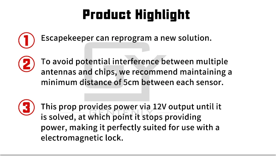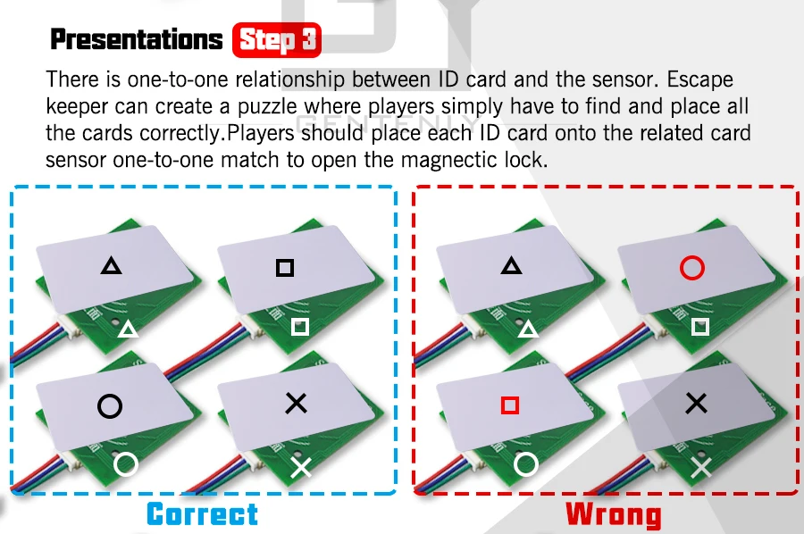 Между rfid-датчиком и rfid-картой существует Единовременная связь. Владелец Escape room может создать пазл, где игрокам просто нужно правильно найти и разместить все карты. Чтобы разблокировать maglock, игрок должен поместить каждую rfid-карту на соответствующий датчик карты один на один.