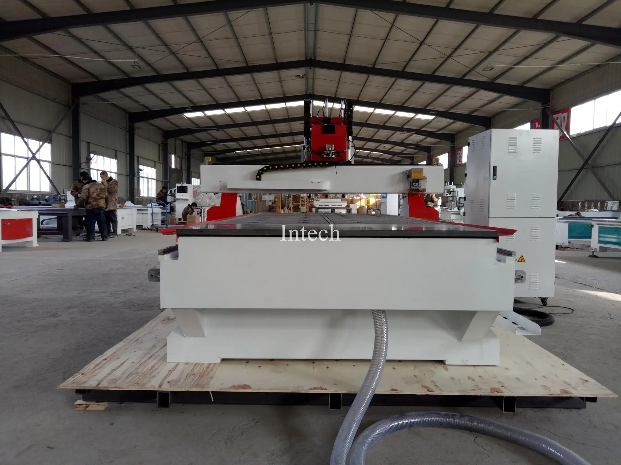 The Configuration of the cnc routerNameX,Y,Z working area1300*2500*200mm Machine PrecisionProcessing Precision±0.1mmRepeat Positioning Accuracy±0.3mm Machine StructureWork TableT-Slot table withVacuum tableX,Y,Z tramissionX,Y rack pinion,Z axis cylinder SpeedMax travelling speed25m/minMax cutting speed15-20m/min Spindle MotorSpindle Power4.5kw air cooling spindleSpindle Speed0-18000RPMDimeter of cutterΦ3.175-Φ16mmOperation SystemWeihong control system/MACH3Operation InstructionG-code,*NcGuide RailSquare RailReducerSAMPO ReducerMotorLeadshine MotorConverterFuling ConverterVacuum PumpAir cooling Vacuum PumpDust Collector4.0KW Twin Tube Dust Collector Overall Size3100*1850*1600mmSamplesPacking:1. Our wooden case is after fumigation treatment. Needn’t timber inspection, saving shipping time.