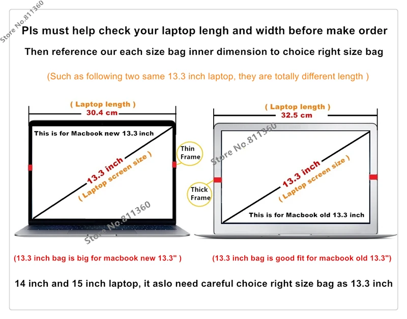 13.3 inch bag is not good fit for all brand laptop 13.3 inch, Such as For macbook new 13.3 inch, own thin screen frame, the laptop outer length is 304 mm,but for macbook old 13.3 inch laptop outer length is 325 mm.