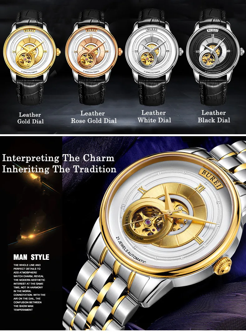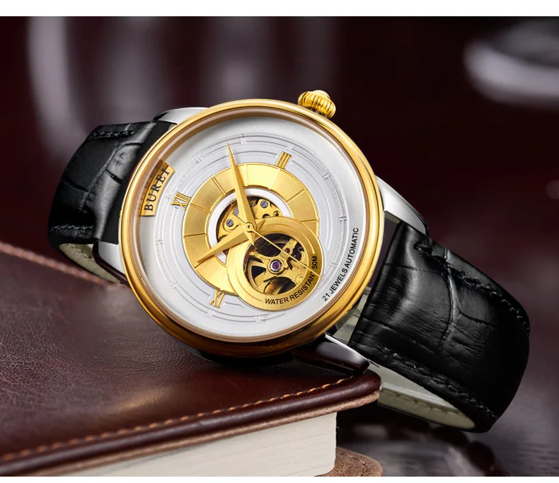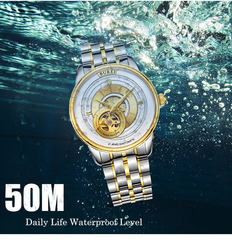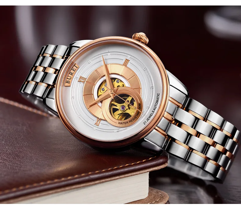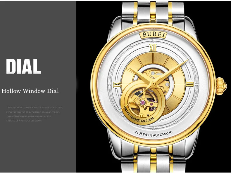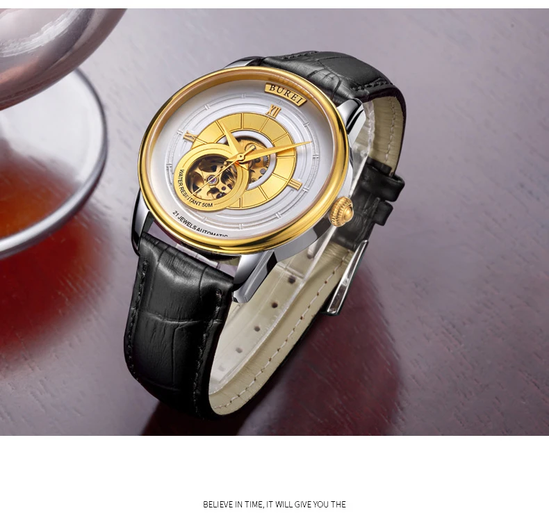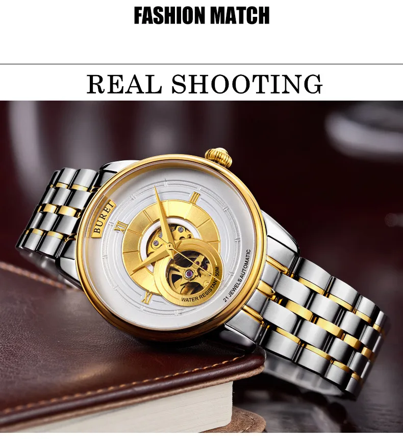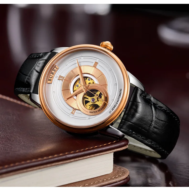 BUREI Brand Fashion Gold Automatic Watch Men Luxury Waterproof Fashion Hollow Business Mechanical Wristwatches Relogio Masculino