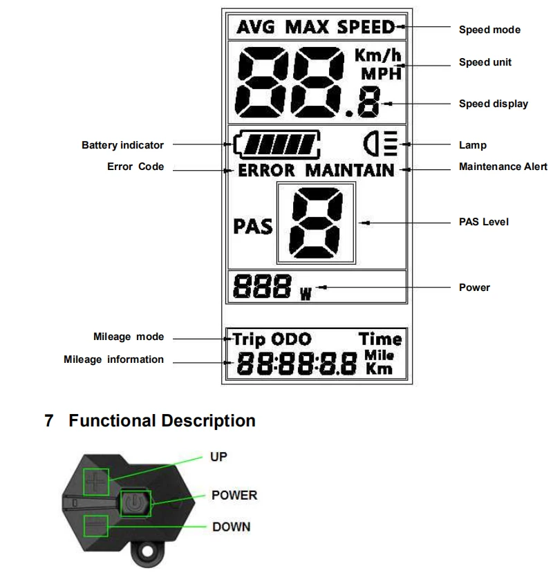 24V/36V Питание от аккумулятора (48V опционально) Номинальный рабочий ток: 10 мА Макс. Рабочий ток: 30 мА Ток утечки <1uA Максимальный выходной ток к контроллеру: 50 мА Рабочая температура: -20 ~ 70 ℃ Температура хранения: -30 ~ 80 ℃ Особенности: Эргономичный дизайн внешней кнопки, прост в эксплуатации. Дисплей скорости: скорость AVG, максимальная скорость, скорость (в режиме реального времени). Километр/миля: может быть установлен в соответствии с привычками клиентов. Индикатор заряда батареи Яркость подсветки регулируется: 5 секций. 9-уровень Assist: 3-х уровневый/5-уровневая/9 уровня, по желанию. Индикатор пробега: одометр/расстояние поездки/время езды.