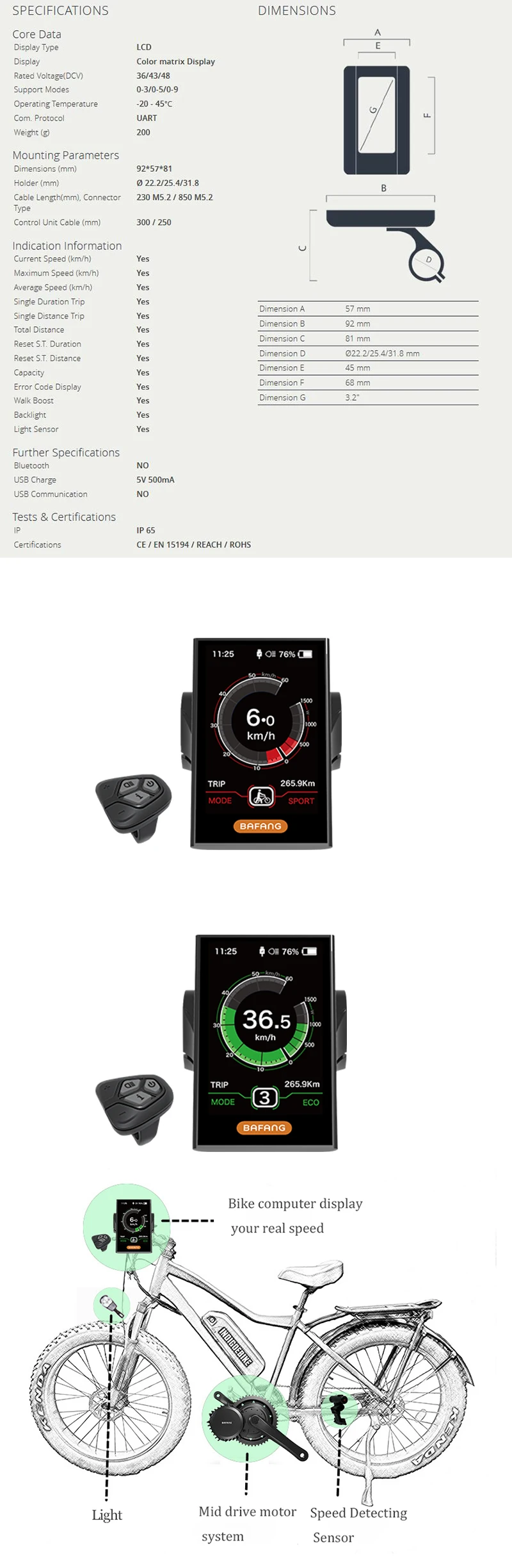 3,2 дюймов IPS экран Источник питания батареи 24 В/36 В/48 В/52 в Номинальный рабочий ток: 40 мА Ток утечки <1uA Максимальный выходной ток к контроллеру: 100 мА Рабочая температура: -20 ~ 70 ℃, Температура хранения: -30 ~ 80 ℃ Особенности: Высококонтрастный 3,2 дюймов IPS красочная Матрица экрана. Эргономичный дизайн внешней кнопки, прост в эксплуатации. Дисплей скорости: скорость AVG, максимальная скорость, скорость (в режиме реального времени). Километр/миля: может быть установлен в соответствии с привычками клиентов. Умный индикатор заряда батареи: обеспечивает надежный индикатор заряда батареи. 9-уровень Assist: 3-х уровневый/5-уровневая/9-уровень/UBE (6-уровневый) Опциональная работа. Индикатор пробега: одометр/расстояние поездки/часы/время езды/диапазон. Индикатор питания: индикатор питания в реальном времени, цифровой или аналоговый. Индикатор кода ошибки. Обновление программного обеспечения: программное обеспечение может быть Обновлено через UART.