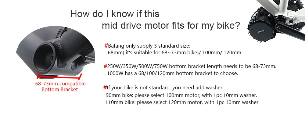Этот средний приводной двигатель подходит для велосипеда с широким нижним кронштейном 68 мм или 73 мм. Внутренний диаметр кронштейна должен быть не менее 33,5 мм.