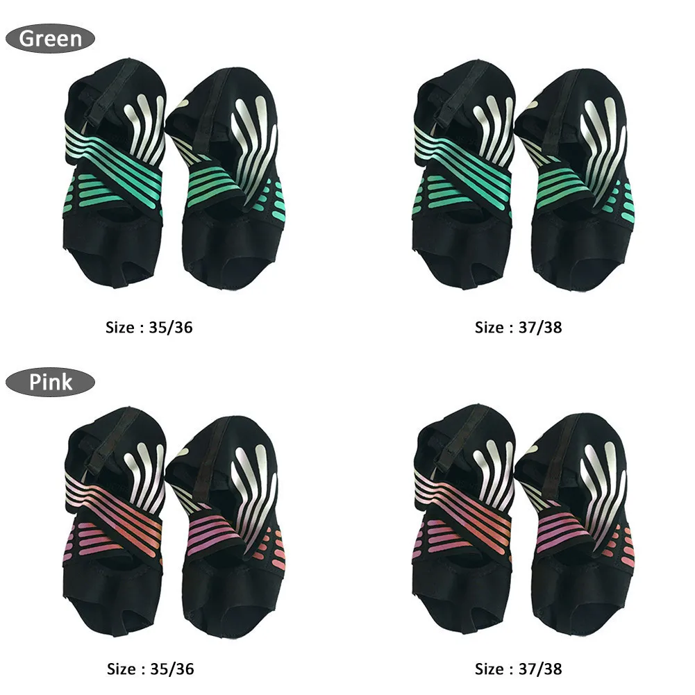 ОписаниеЖенские нескользящие носки с пятью пальцами на мягкой подошве для профессионального балетного йоги обувь для пилатеса розового и зеленого цветов