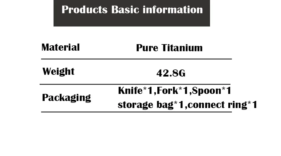 1. Чистый титаниум, легкий и прочный, чем сталь.2. Никогда не ржавеет, не подвержен коррозии кислотой и щелочью.3. Высокая устойчивость к экстремальным низким и высоким температурам.4. Здоровый, экологически чистый, близкий к человеческому телу.5. Титан может подавить рост бактерий6. Светильник вес только 42,8 г, не вредит здоровью, легкоочищающийся.7. Более удобно носить с собой и использовать на открытом воздухе.Спецификация титановых столовых приборов:1. Материал: чистый титан2. Размер:Ножи: длина 187 мм, Вес: 12,3 гВилка: длина 160 мм, вес: 12 гЛожка: длина 164 мм, Вес: 14,5 гКольцо подключения: 4G