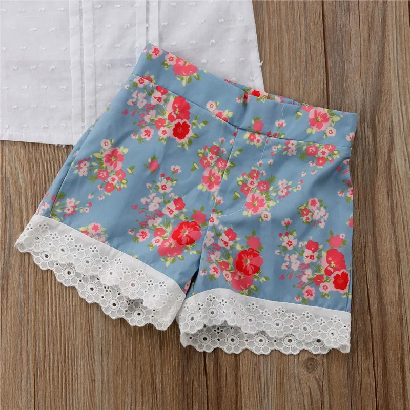 Комплект летней одежды для маленьких девочек, модные кружевные топы с цветочным рисунком для девочек, мини-платье, шорты комплекты из 2 предметов комплект детской одежды!