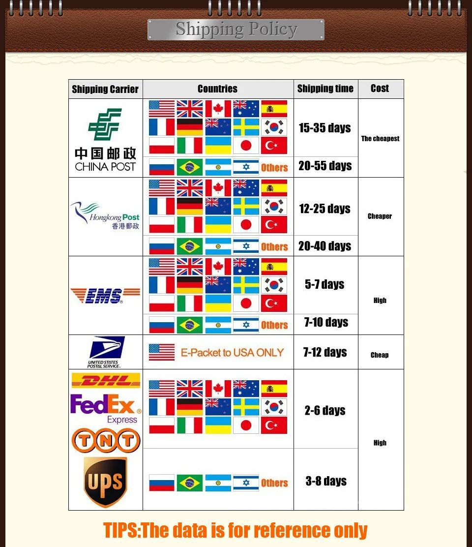 2. Большинство посылок отправляются через почту Гонконга, почту Сингапура или Почта Китая (все с номером отслеживания). Для большого заказ (зависит от веса и стоимости), мы отправляем через другой более быстрый carier, как DHL, EMS, FedEx...