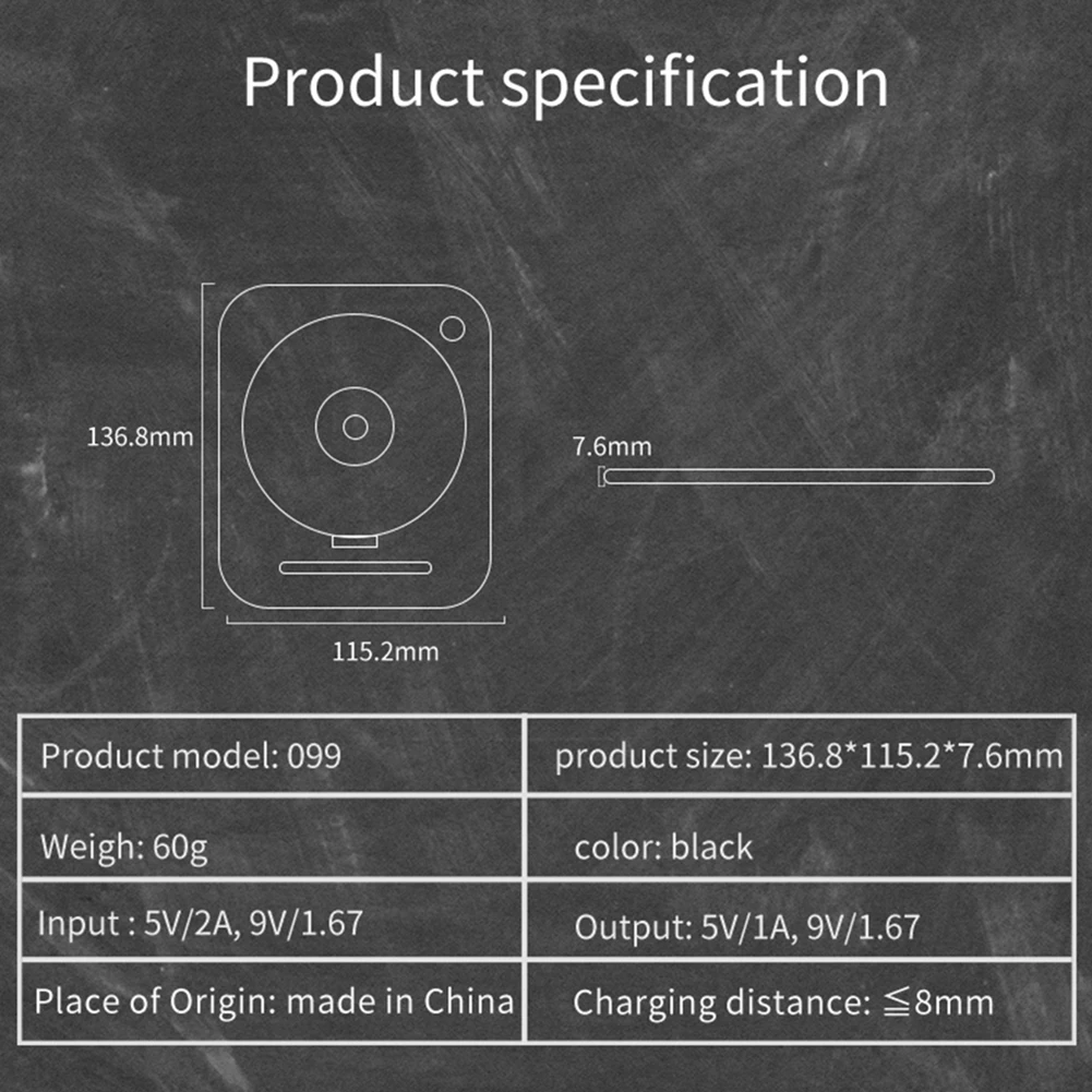 -Поддерживает протокол беспроводной зарядки QI, надевает телефон для зарядки без кабеля передачи данных, защита от избыточного заряда защита от короткого замыкания Защита от перенапряжения.