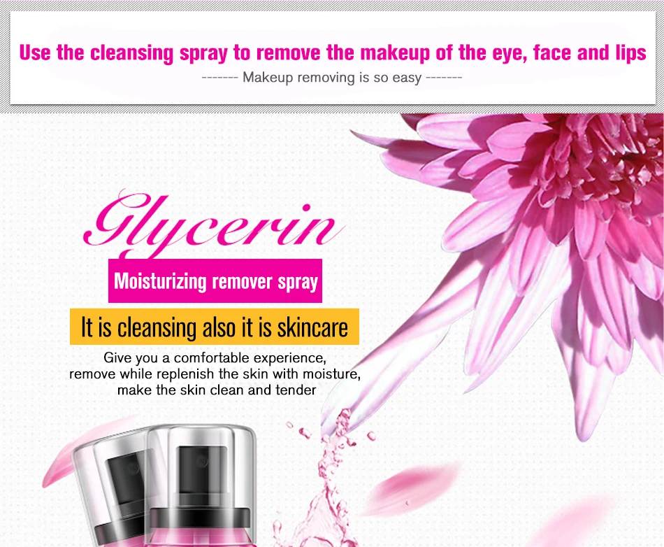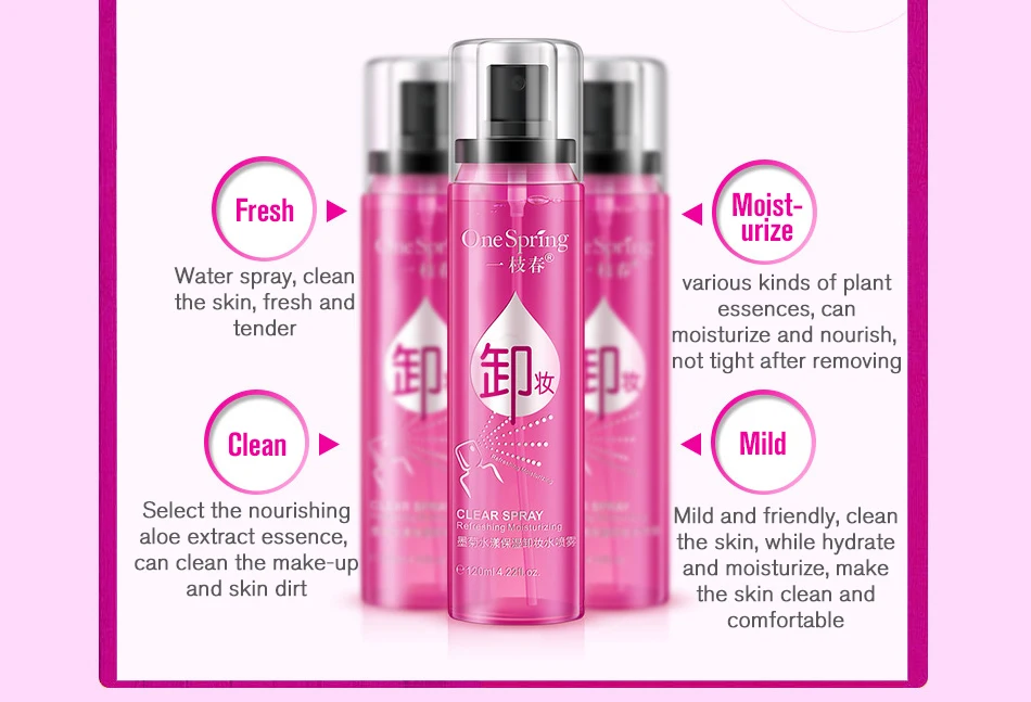 Продукты содержат натуральные растительные экстракты, аккуратно удаляют, очищают кожу, свежее и проникающее, нежное и увлажненное. Спрей для удаления воды, свежий и non-greasy.Spray прост в использовании, протирается и легко чистится. Мягкая и приятная, очищает кожу, увлажняет и увлажняет, делает кожу чистой и удобной