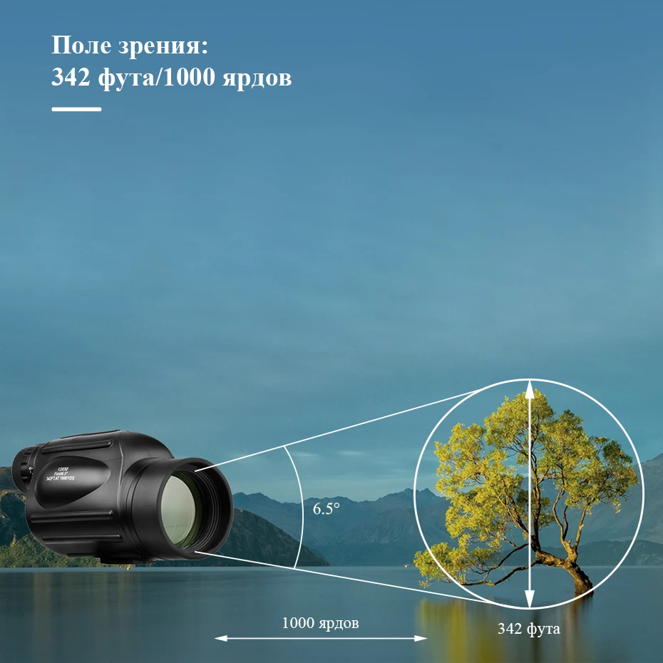 Поле зрения: 342 фута / 1000 ярдов означает, что при просмотре объектов на расстоянии 1000 ярдов вы можете видеть область шириной 342 фута. Угол поля зрения составляет 6,5 градусов, что обеспечивает комфортное удаление зрачка, и гуманизированный опыт наблюдения.