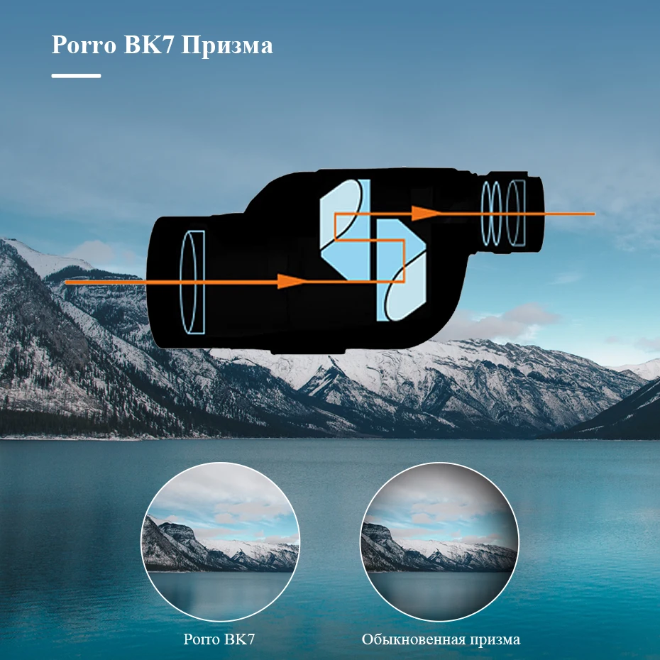 Призма Porro BK7 дает вам гораздо более четкое 3D-изображение, чем другие, и обеспечивает гораздо большее поле зрения. Призма Porro лучше подходит для тех случаев, когда вам нужно более четкое изображение или более широкий угол обзора. Таким образом, этот монокуляр очень подходит для наблюдения за птицами, охоты, смотра спортивных мероприятий и использования на открытом воздухе.
