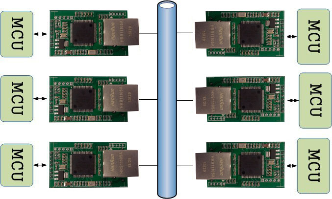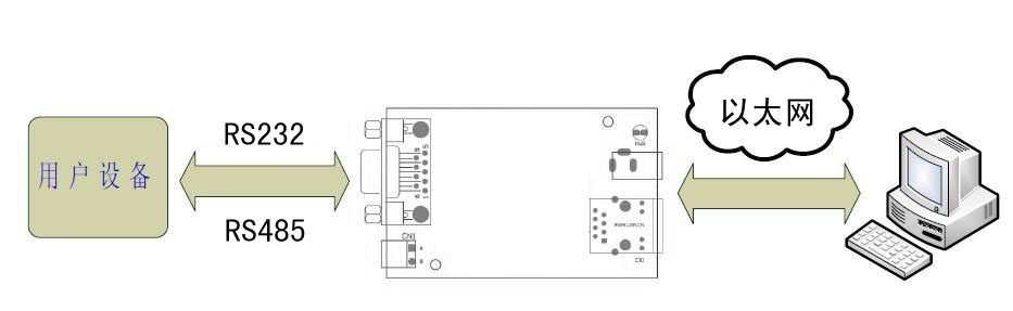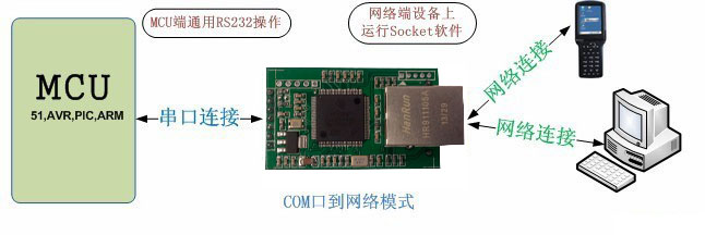 3. Описание оборудования3,1 Рабочая индикаторная лампаРабочий свет модуля находится в сетевом порту, и есть два красных и зеленых светильника.Описание функции индикатораЗеленый светИндикация состояния подключенияКогда ссылка правильно подключена к сети, зеленый свет включен.Желтый светИндикация данныхМодули мигают при получении или отправке данных, включая модули, получающие сетевые вещательные пакеты.Интерфейс модуля 10 M/100 M самоадаптирующийся и поддерживает AUTO MDI/MDIX. Он может быть подключен любым кроссовером или параллельными сетевыми линиями. То есть, вы можете подключиться непосредственно к компьютеру с прямой сетевой линией, и вы также можете проверить его.ШтырьНазваниеОписаниеОдинTX +Передача данных + (сигнал +)ДваTX-Передача данных-(сигнализация-)ТриRX +Получение данных + (получение сигнала +)ЧетыреN/cНе подключен (пустые ножки)ПятьN/cНе подключен (пустые ножки)ШестьRX-Получение данных-(сигнал приема)СемьN/cНе подключен (пустые ножки)ВосемьN/cНе подключен (пустые ножки)4. Схема структуры приложения4,1 COM порт в сетевой режимЭто общий режим работы, модуль один конец к COM интерфейсу, другой конец к сети, для достижения преобразования между сетью и COM, в этом режиме, компьютер должен писать сетевые приложения на основе гнезда для отправки и получения данных.Пользователи должны овладевать знанием сетевого программирования.
