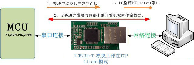 Примечание: По соображениям безопасности, по умолчанию, модуль принимает только данные, отправленные от IP установленного целевого устройства и порта установленного целевого устройства, и модуль отправляет данные только в установленное место назначения. Вы можете легко изменить настройки модуля мгновенного управления для изменения цели отправки (описано позже), или вы можете настроить специальный продукт функции, например, не подтверждать исходный IP, чтобы принять данные, отправленные несколькими IP, чтобы достичь многократного. 2,2 TCP клиентский режим В режиме TCP client, когда модуль включен, он подключается к TCP серверу активно в соответствии с его собственными настройками, затем устанавливает длительное соединение, а затем передает данные прозрачно. В этом режиме IP TCP сервер должен быть виден модулю, что означает, что IP модуля может быть непосредственно PING на IP сервера, сервер может быть фиксированным IP в Интернете, или может быть таким же LAN IP, как модуль.