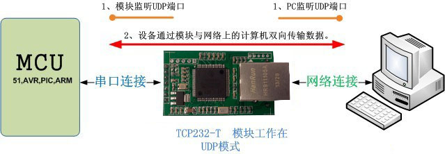 2,3 режим UDPВ режиме UDP модуль контролирует заданный порт после включения питания и не активно устанавливает соединение. Когда данные передаются из последовательного порта, они передаются в последовательный порт. Когда данные получены из последовательного порта, они отправляются в IP и порт, установленный модулем через сеть.