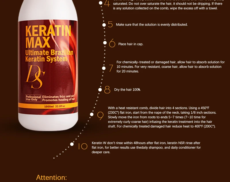 9.Keratin W не образует краску в течение 48 часов после утюга, кератиновую краску NSR после утюга, для более глубокого ухода используйте Ежедневный Шампунь и ежедневный кондиционер.