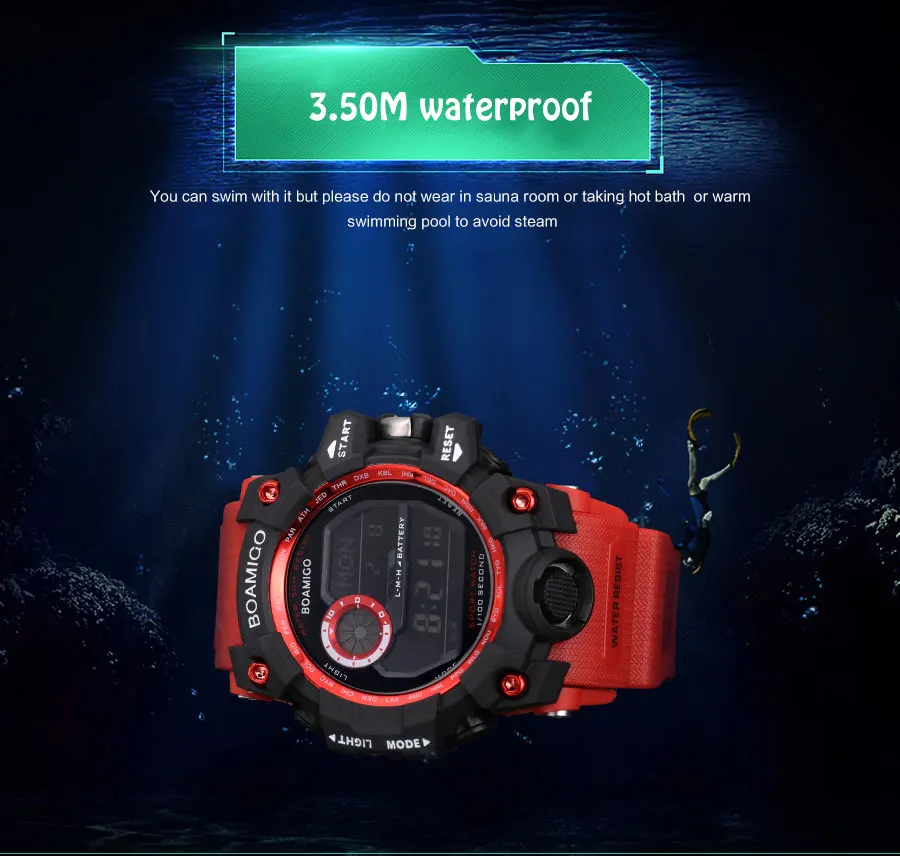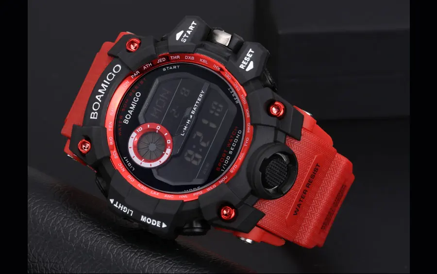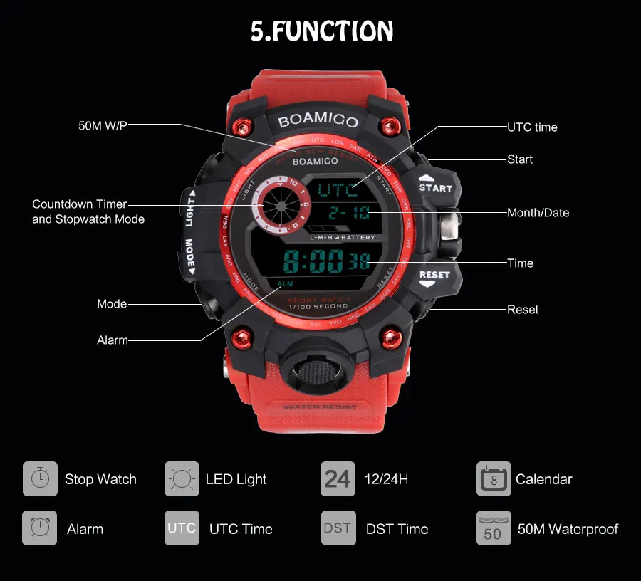 Спорт BOAMIGO Для мужчин Спорт UTC DST время на открытом воздухе светодио дный свет Для мужчин цифровой Спорт Красный военные часы 50 м Плавание Водонепроницаемый резиновая группа Пеший Туризм